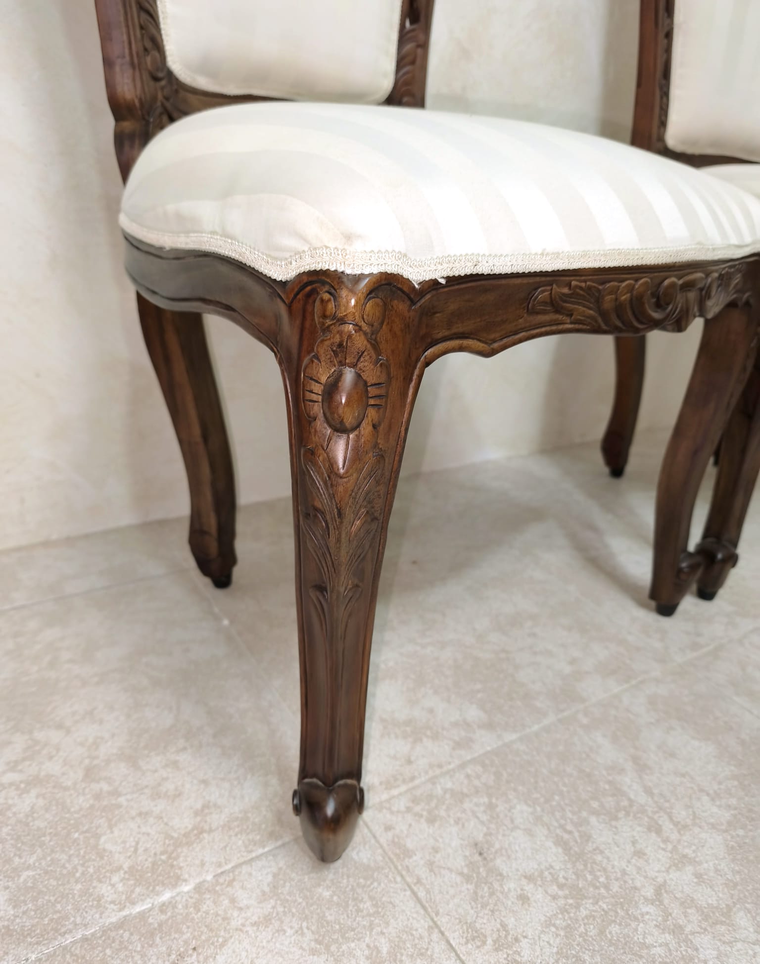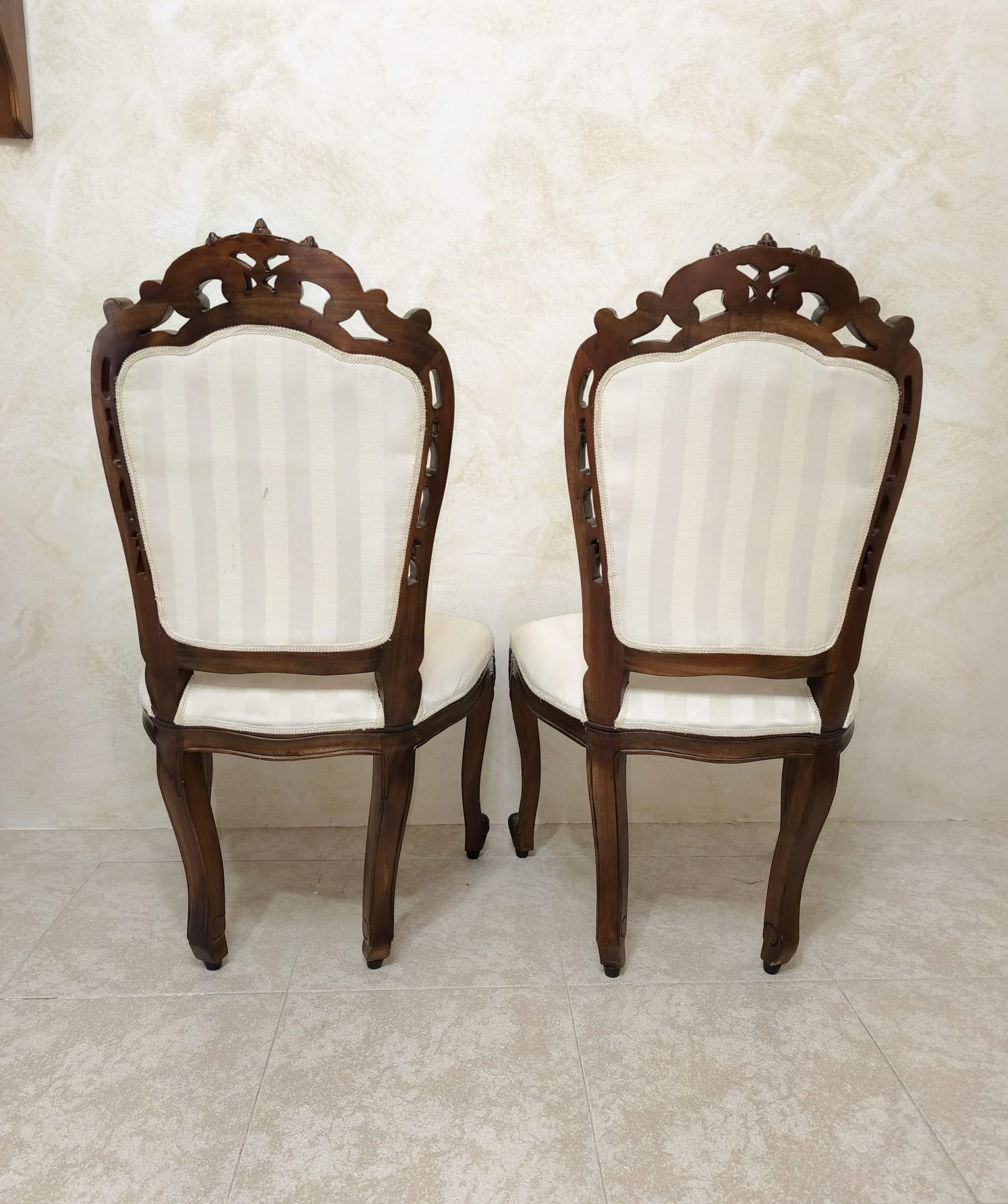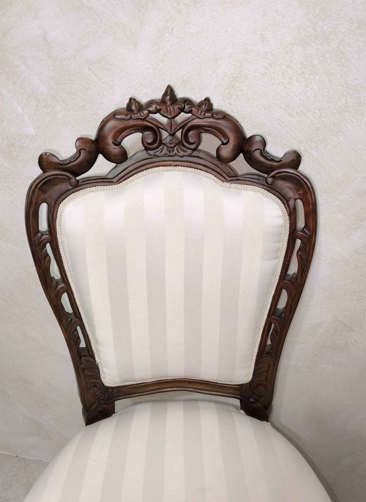 Elegante pareja de sillas Victorianas realizadas en madera tallada y tapicería de tela a rayas en blanco cremoso.