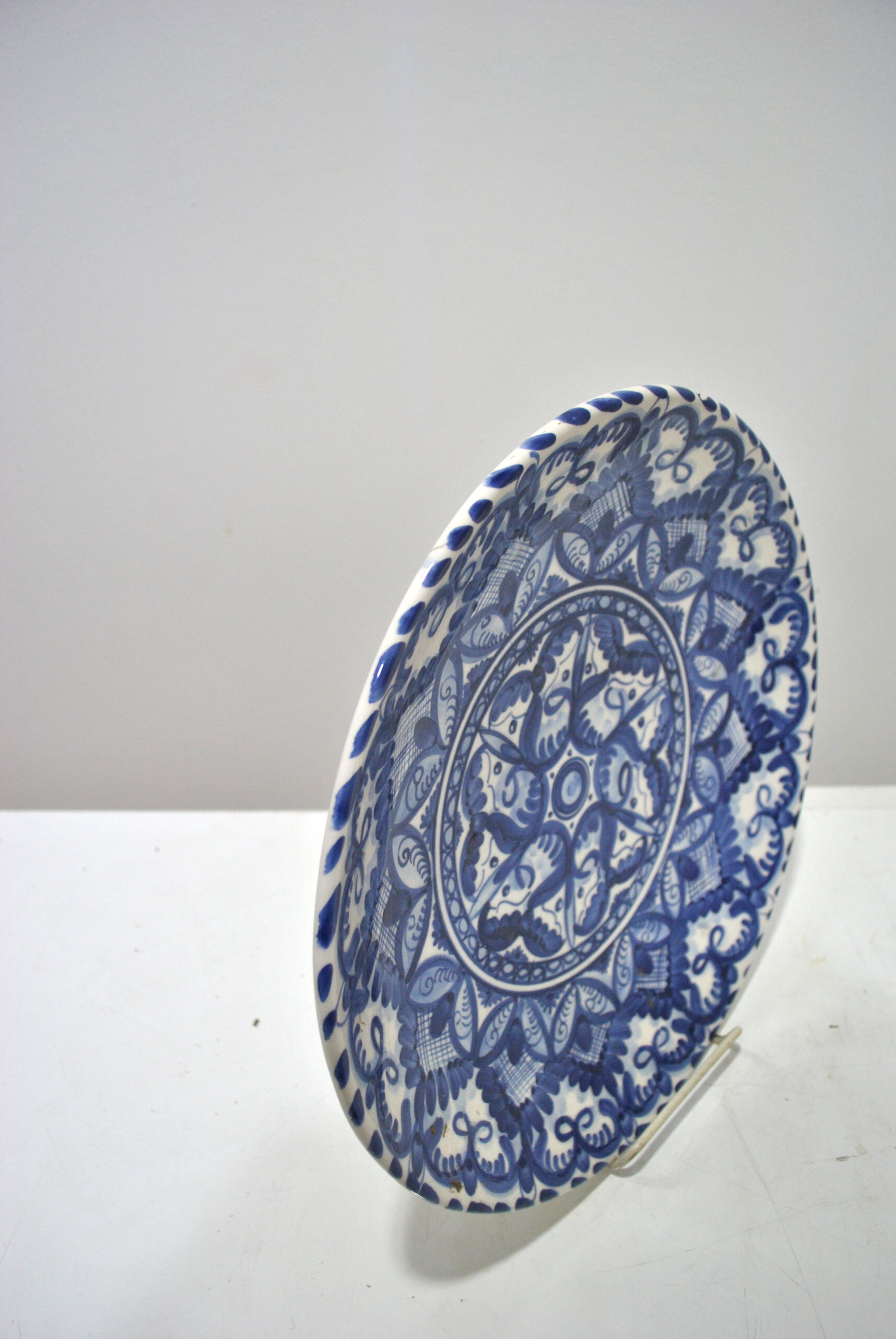 REF: 12228 – Magnífico plato de cerámica antigua decorado en intenso azul cobalto sobre fondo blanco, con un elaborado diseño ornamental de inspiración tradicional. La pieza presenta una rica composición de motivos florales y elementos geométricos dispuestos en forma radial, creando un efecto visual elegante y equilibrado.