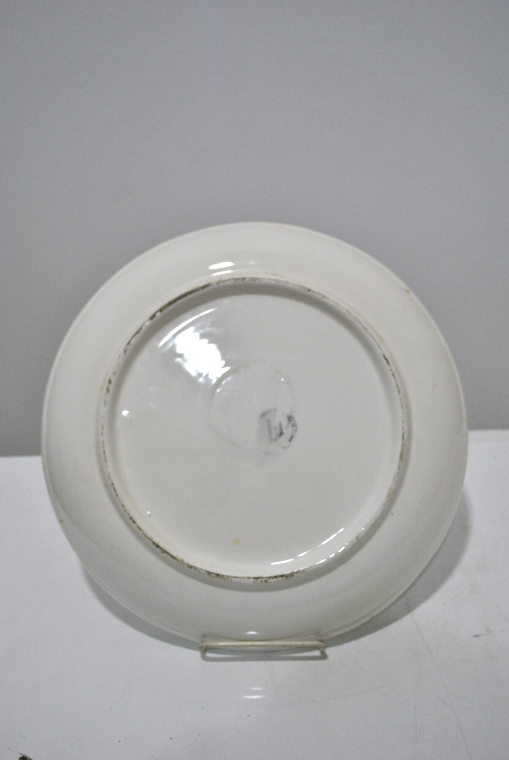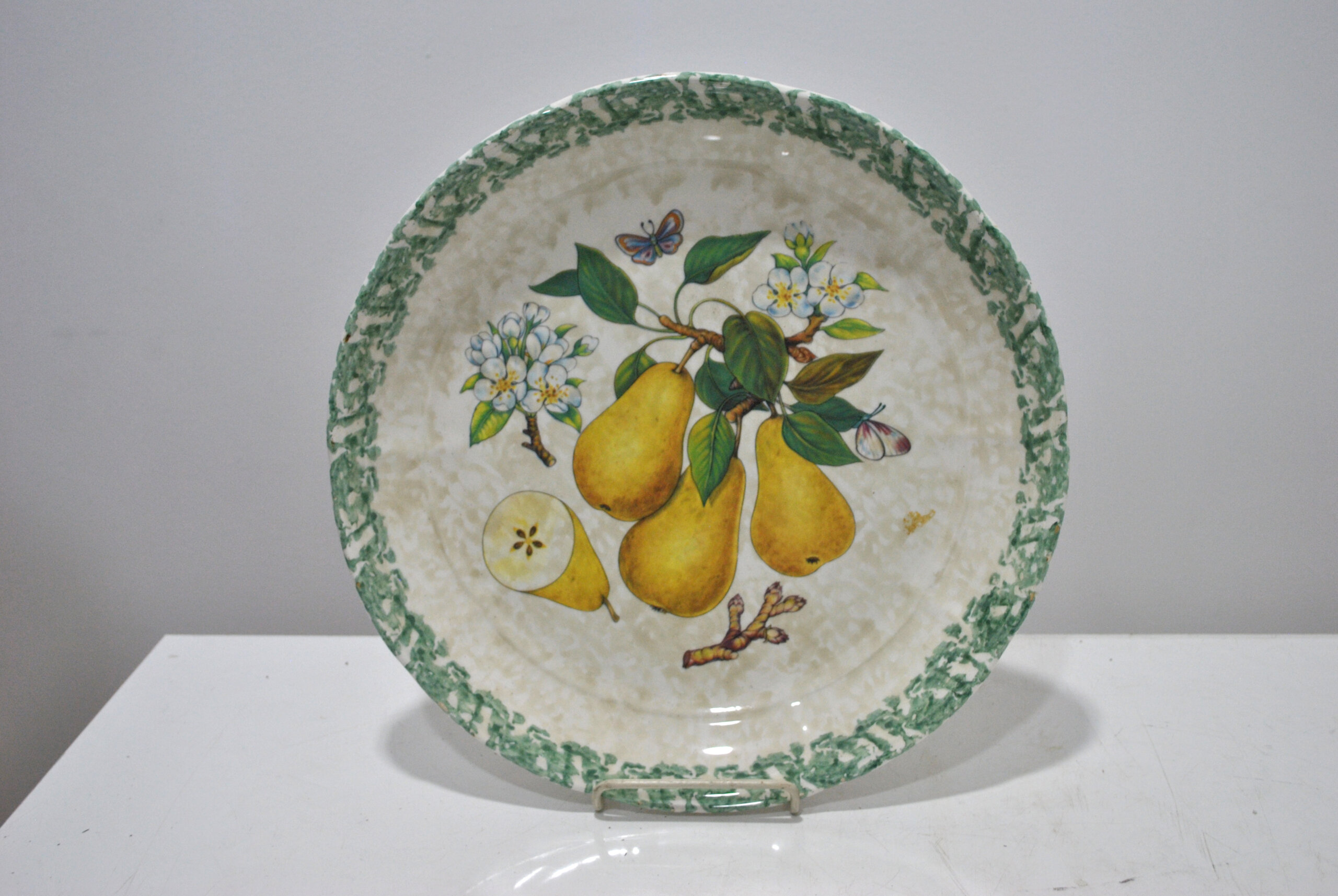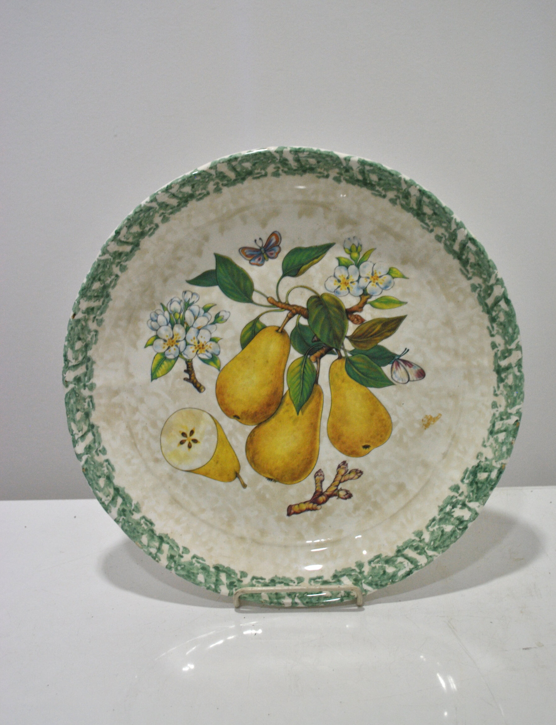 REF: 12221 – Bonito plato antiguo de cerámica decorado con motivo de peras, flores y mariposas en el centro, acompañado de una cenefa verde en el borde. Pieza con encanto y estilo clásico, ideal para decoración o colección. Presenta leves señales de uso propias del paso del tiempo.