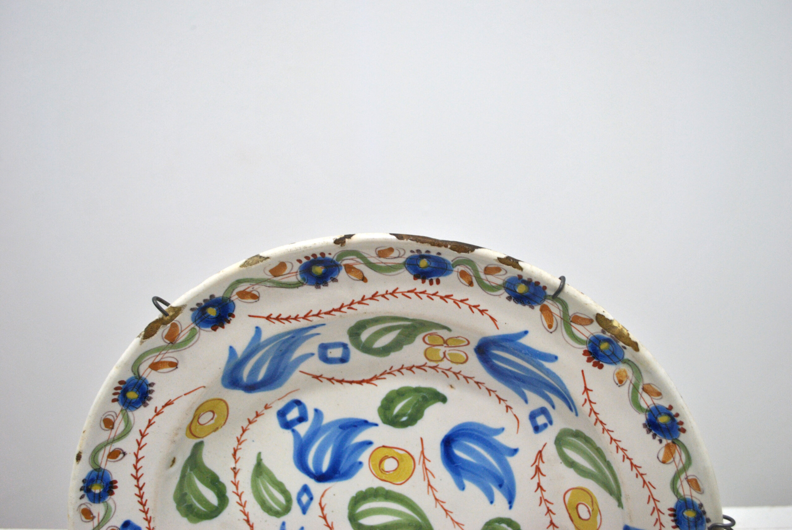 REF: 12224 – Bonito plato antiguo de cerámica con decoración policromada pintada a mano, destacando sus motivos florales en tonos azules, verdes y amarillos sobre fondo blanco. Pieza ideal como elemento decorativo de pared o colección. Presenta señales del paso del tiempo que le aportan carácter y autenticidad. Incluye sistema de sujeción trasero.