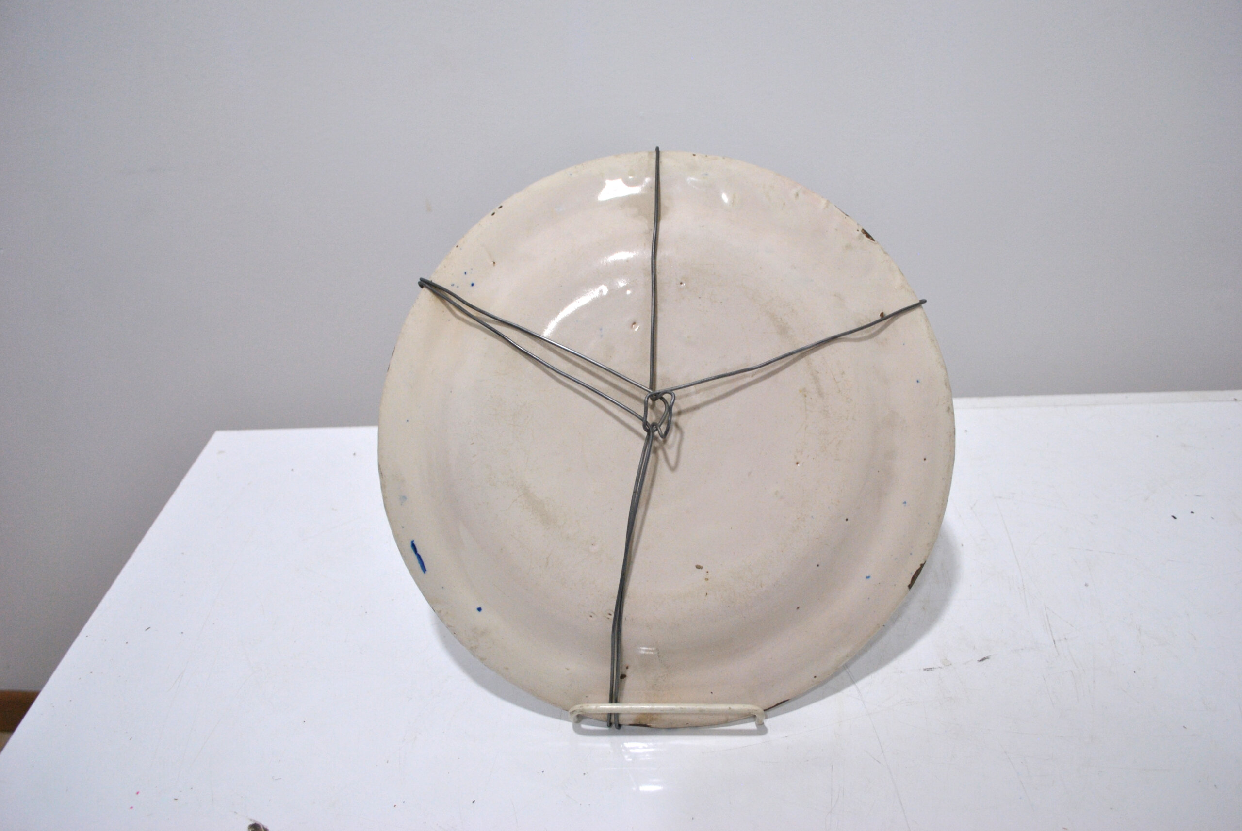 REF: 12223 – Bonito plato antiguo de cerámica decorado con flores en tonos azules, verdes y amarillos, con cenefa decorativa en el borde. Pieza artesanal con encanto, ideal para colgar o decorar. Presenta señales de uso y paso del tiempo que realzan su carácter antiguo.
