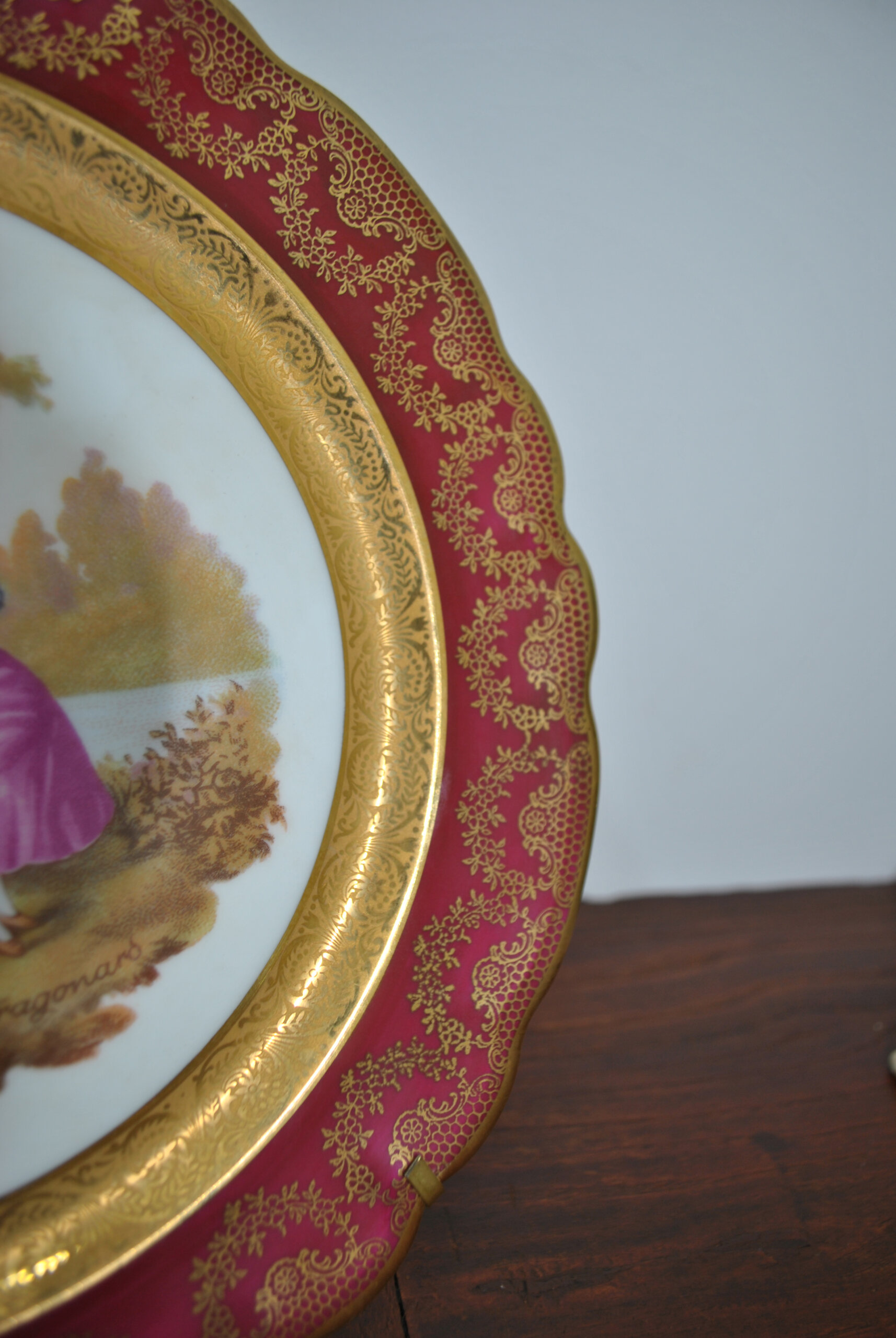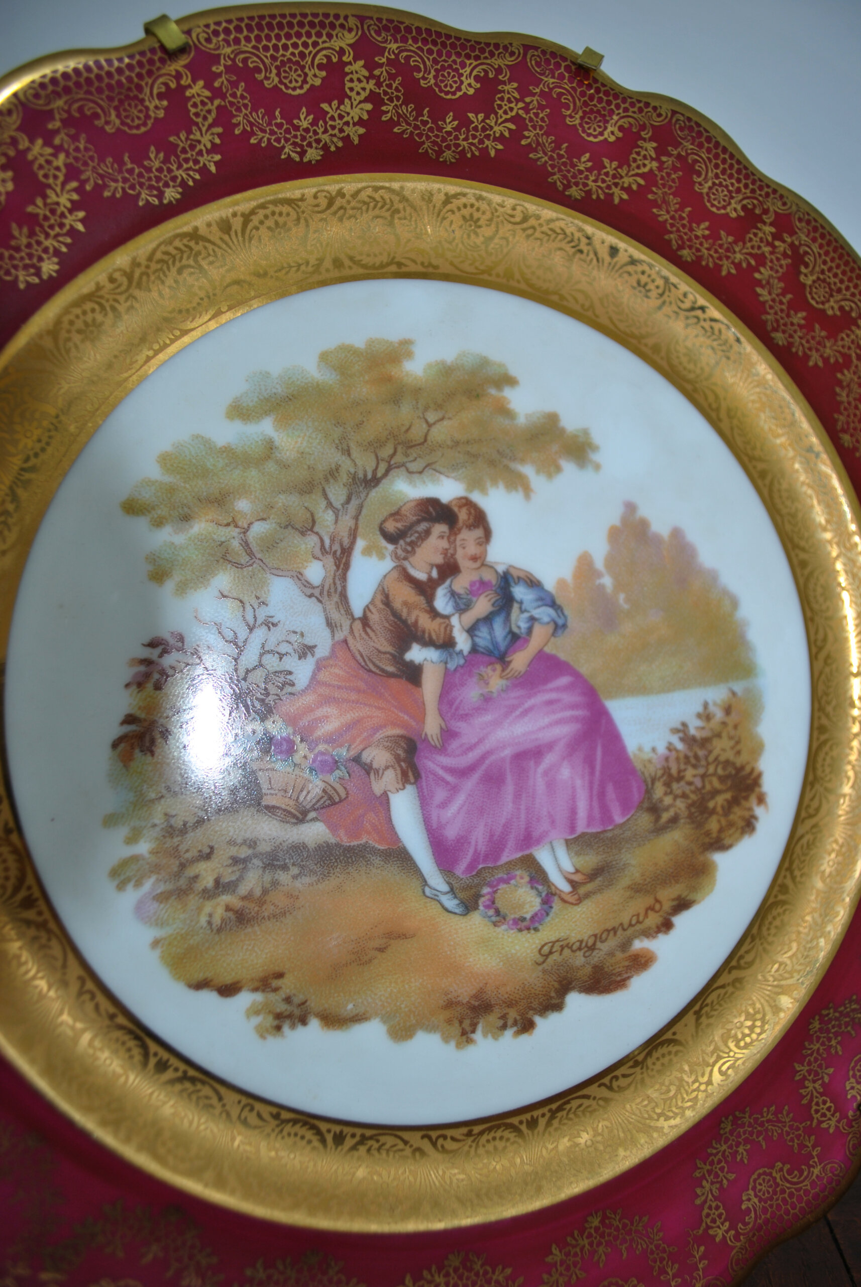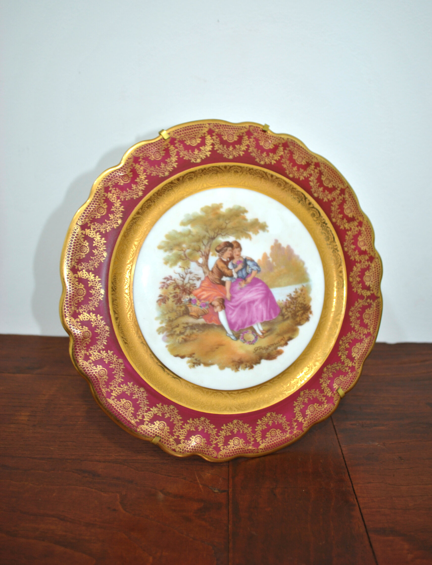 Presenta una delicada escena romántica central de estilo galante, firmada Fragonard, representando a una pareja en un paisaje campestre. La composición está enmarcada por un amplio ala en intenso tono rojo carmín, ricamente decorada con motivos florales y guirnaldas en dorado, y rematada con un filo ondulado también perfilado en oro.