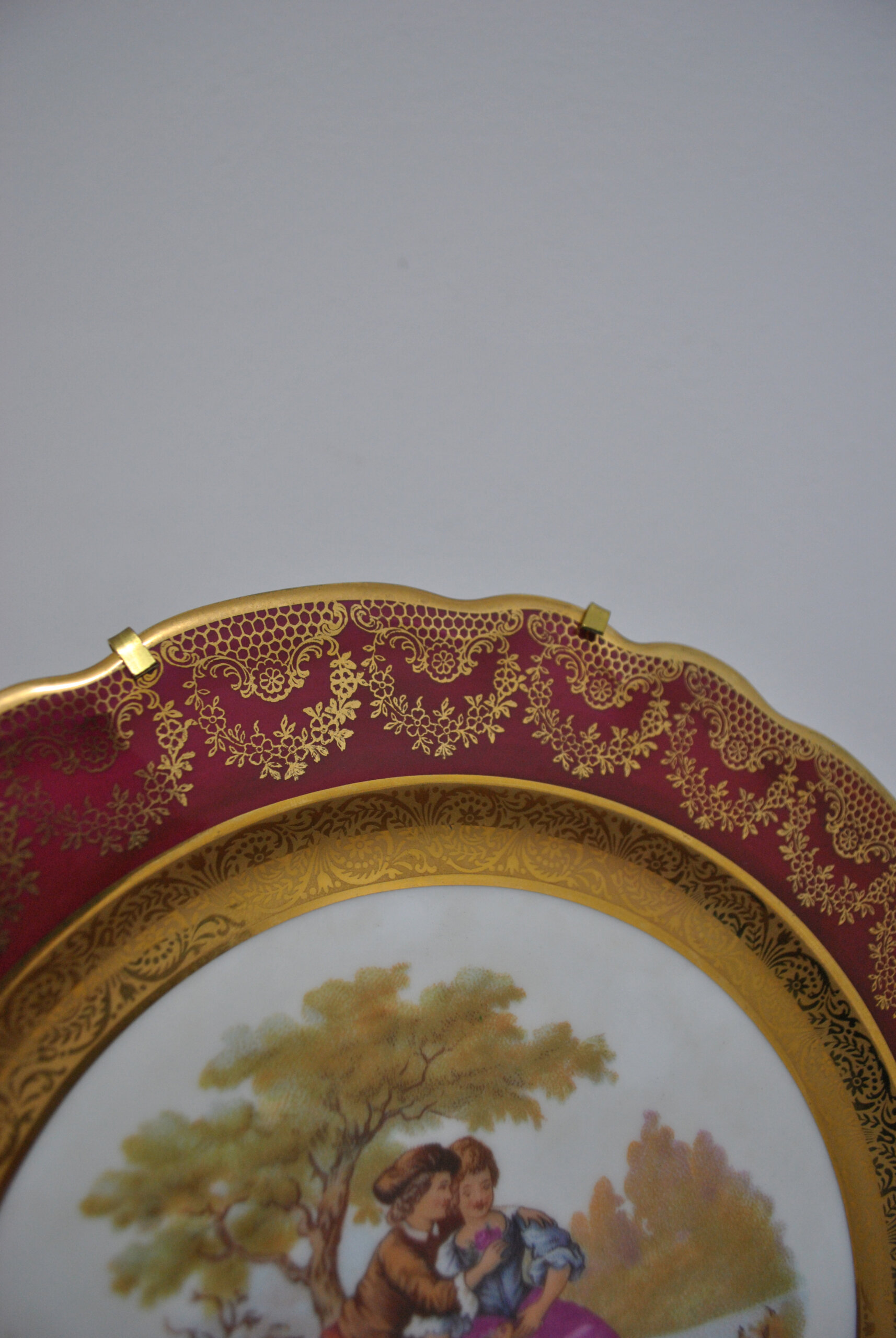 REF: 12142 – Elegante plato decorativo de porcelana francesa Limoges, pieza refinada de inspiración clásica con exquisita ornamentación en oro fino.