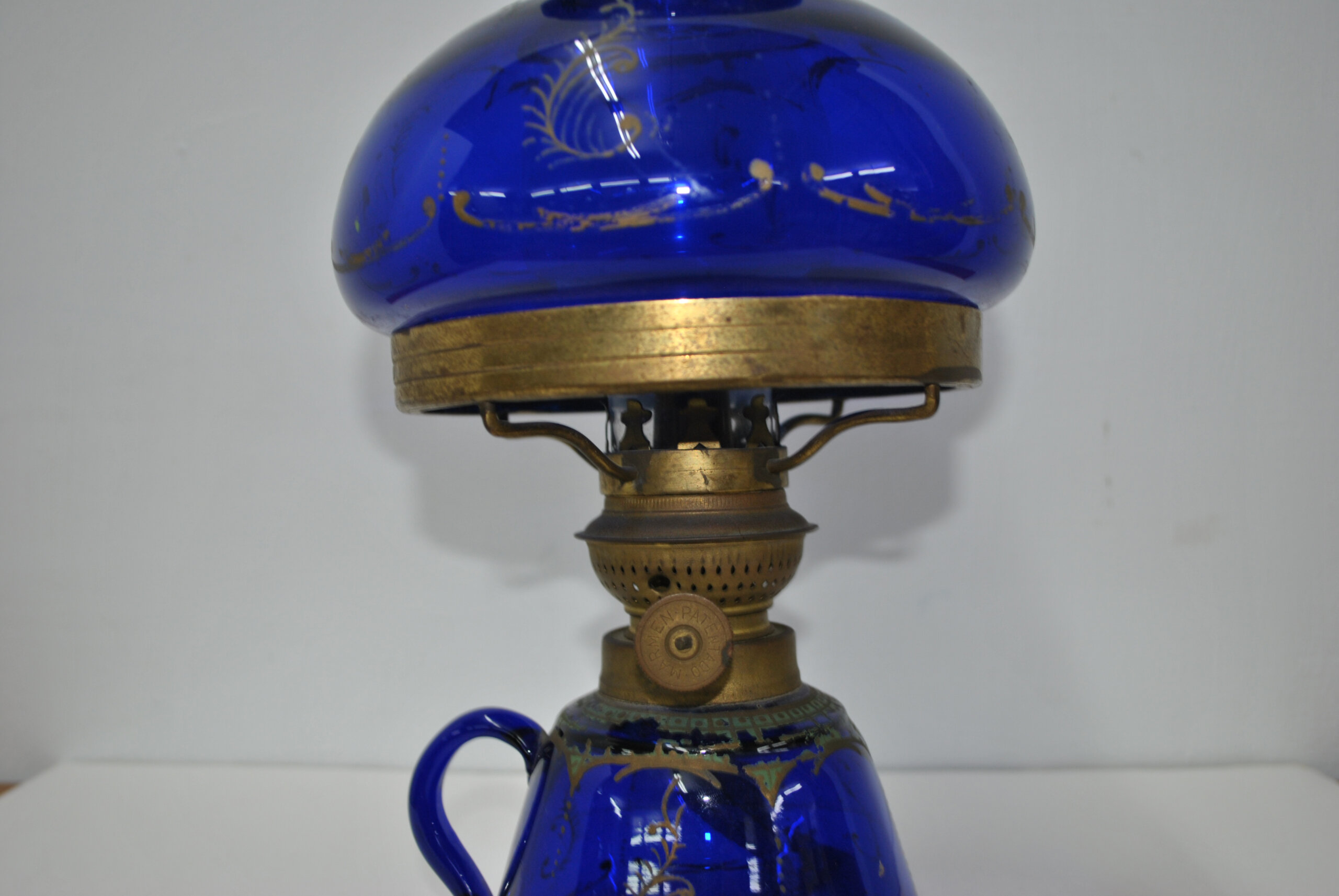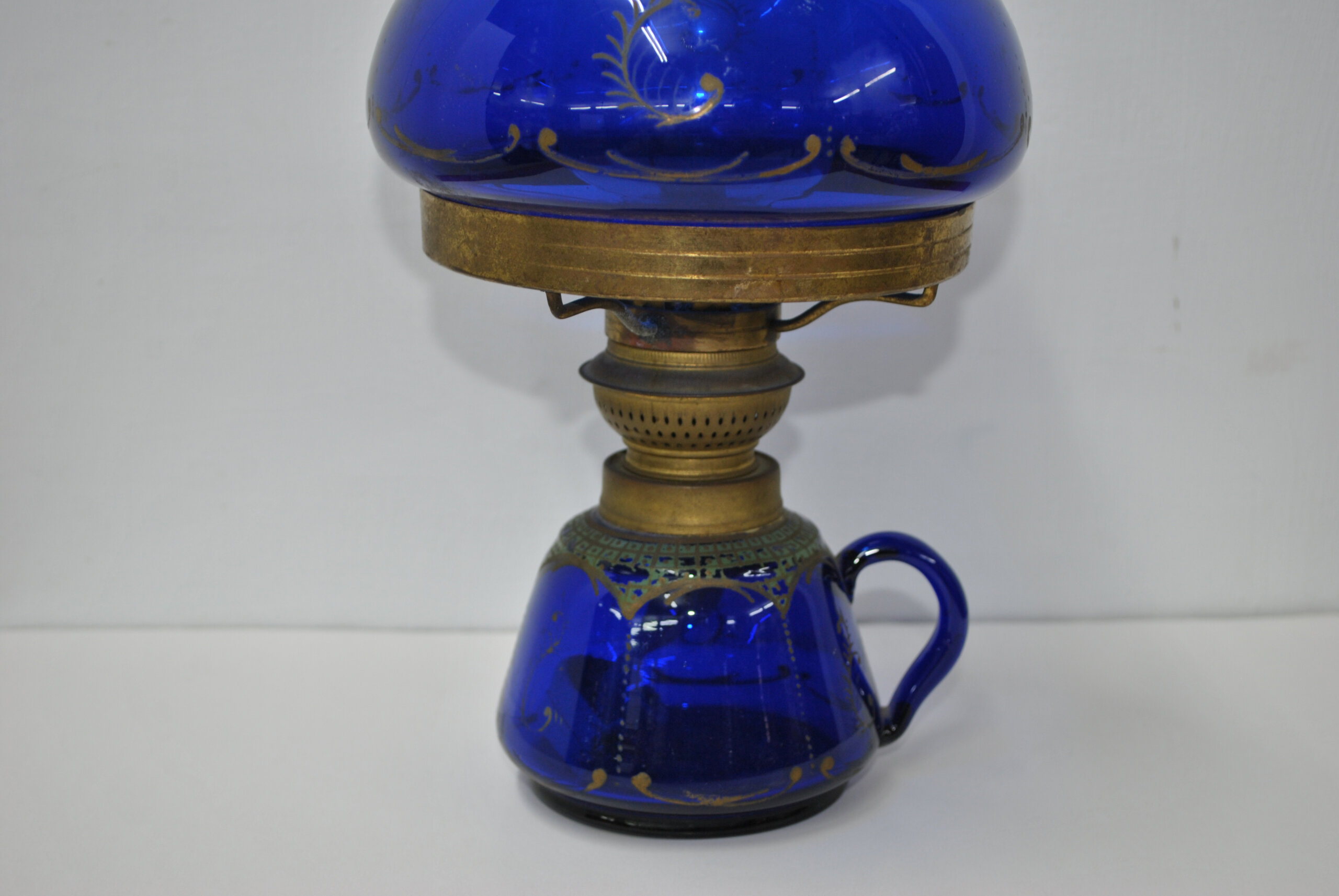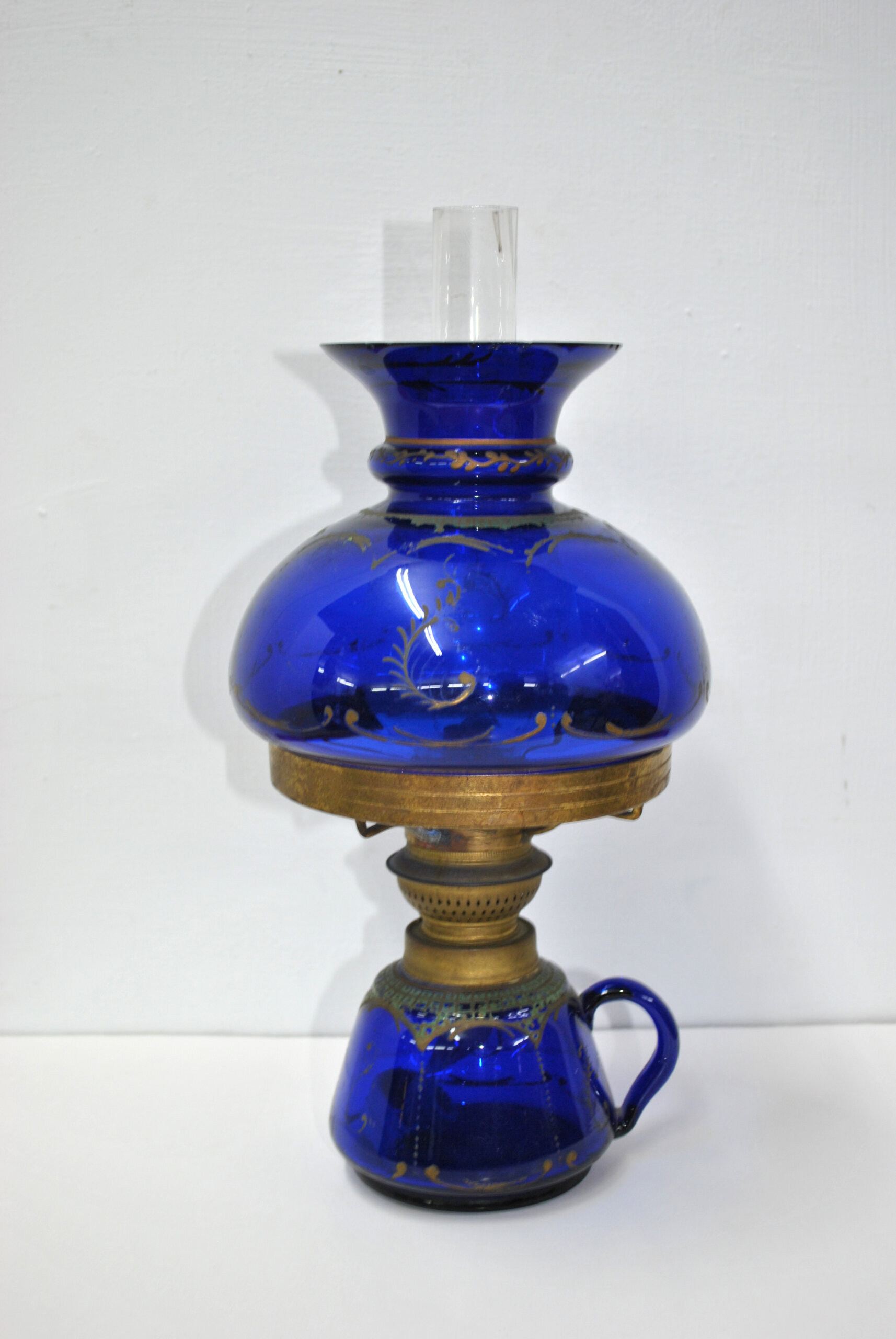 REF: 12329 – Precioso quinqué antiguo, una pieza decorativa de gran belleza que destaca por su intenso color azul cobalto y sus delicados detalles en dorado.