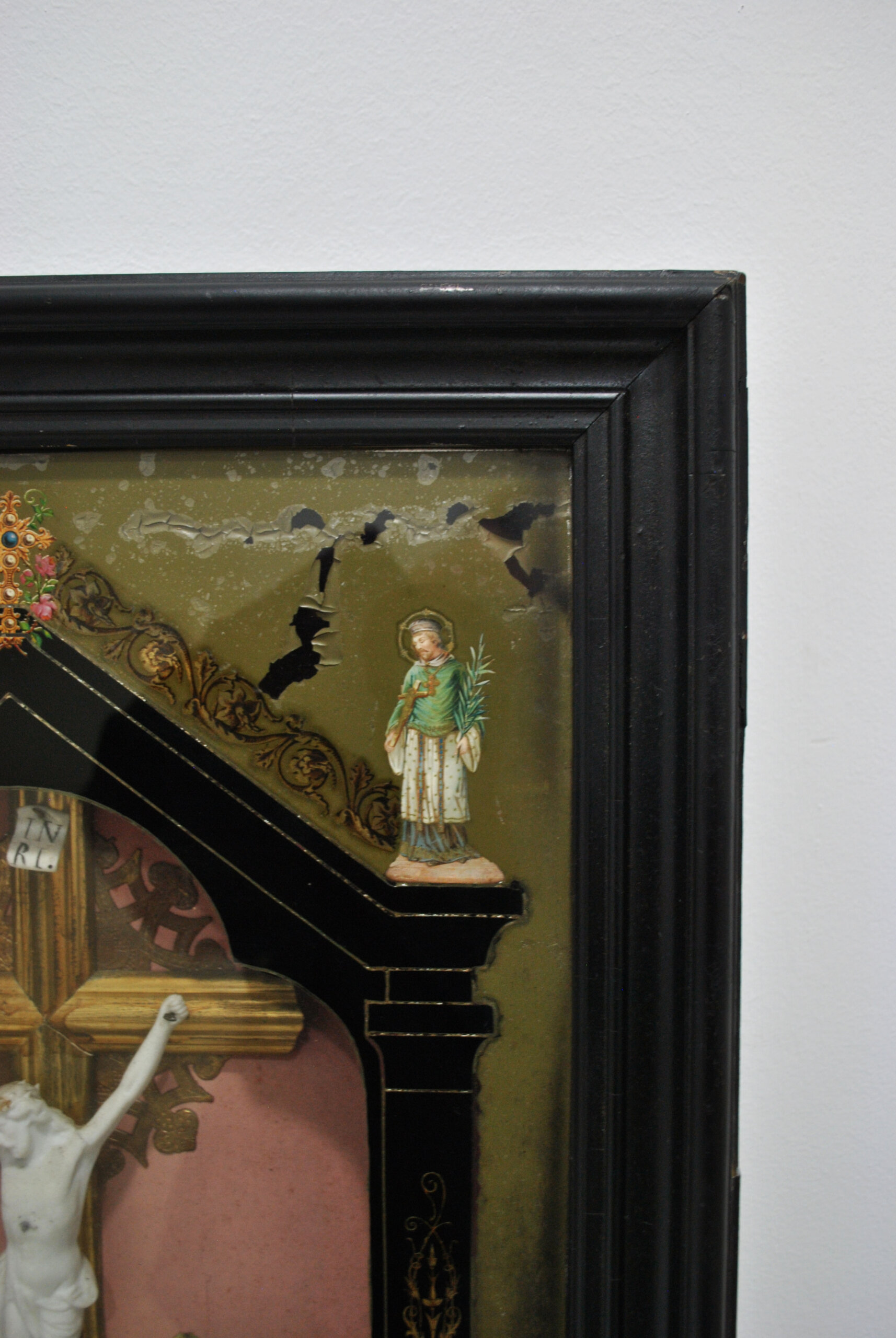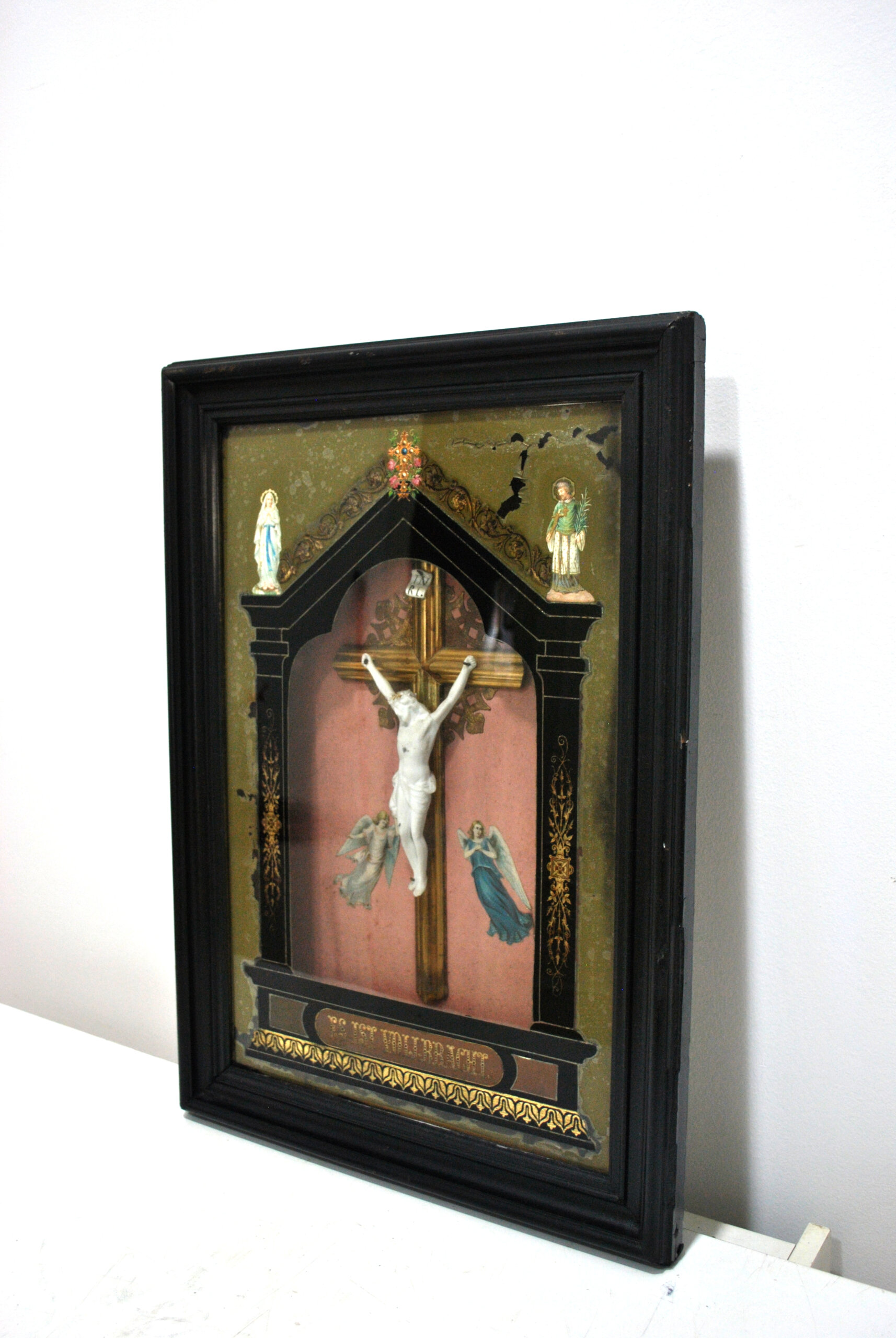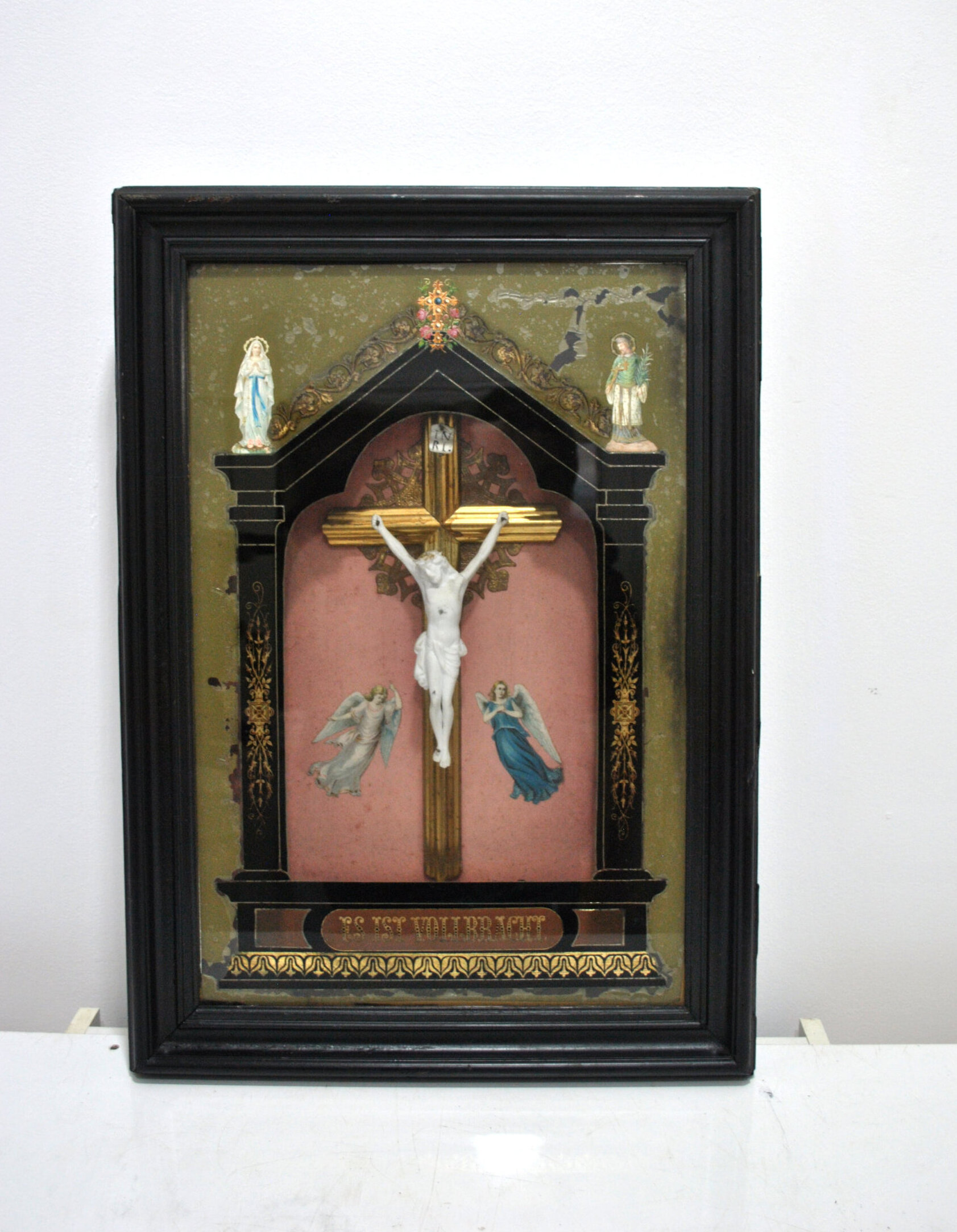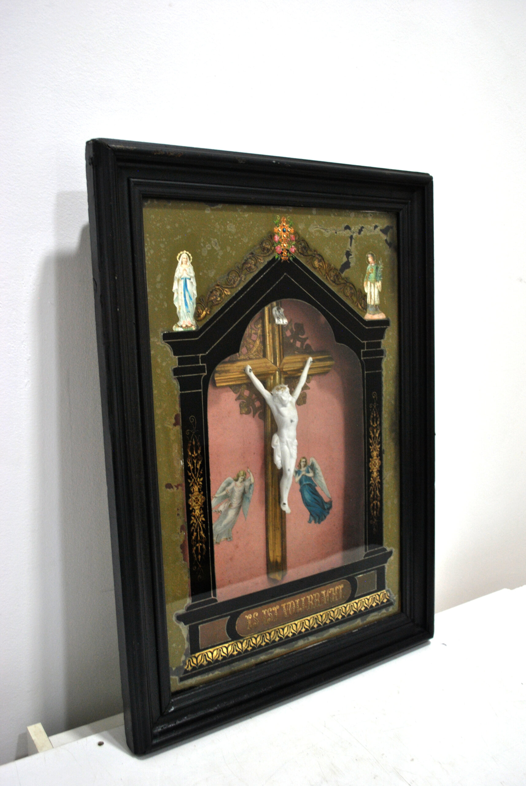 REF: 12419 – Antiguo y delicado relicario religioso enmarcado, representando a Cristo crucificado en una elegante composición tipo capilla, de gran valor devocional y decorativo.