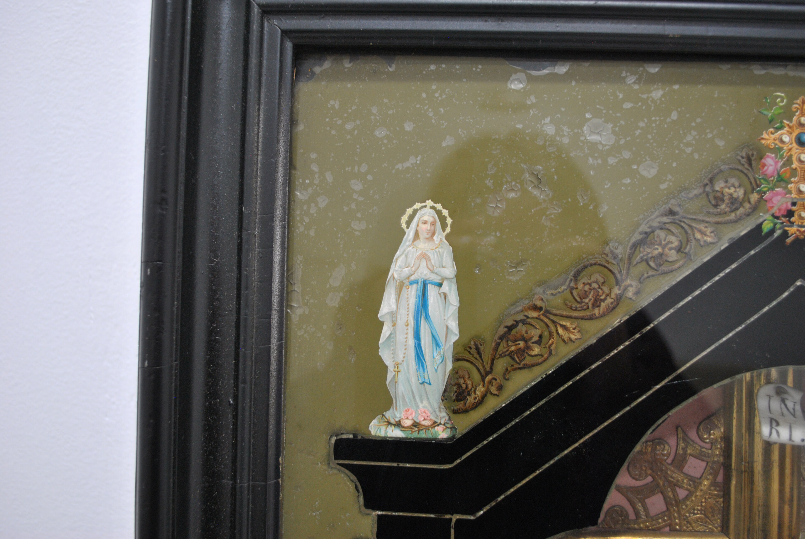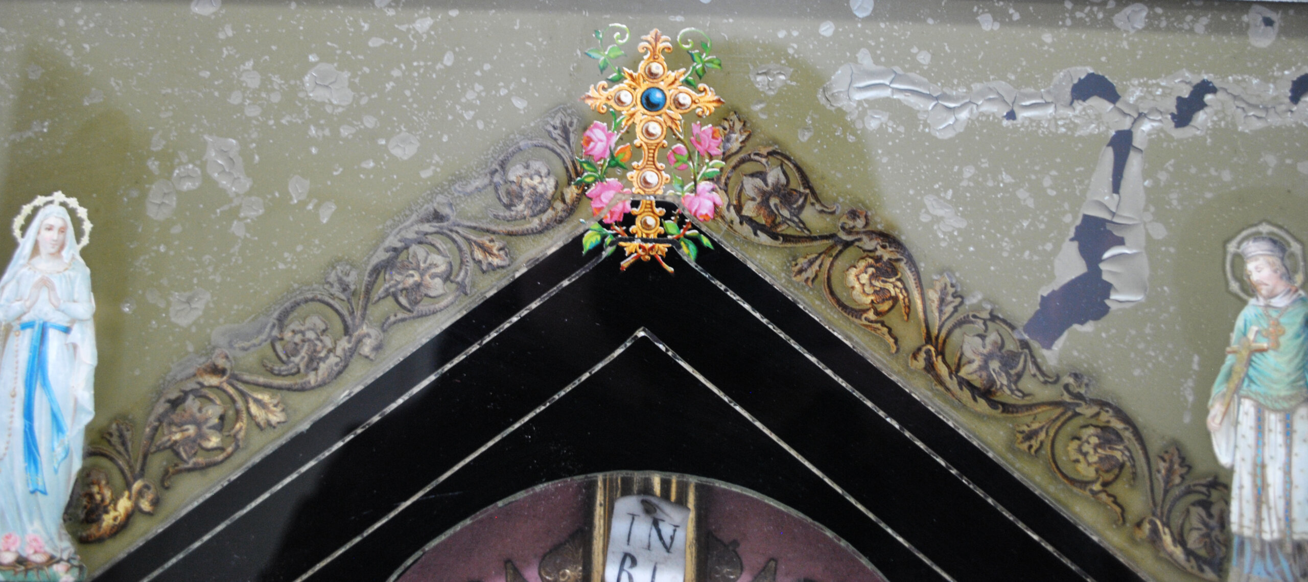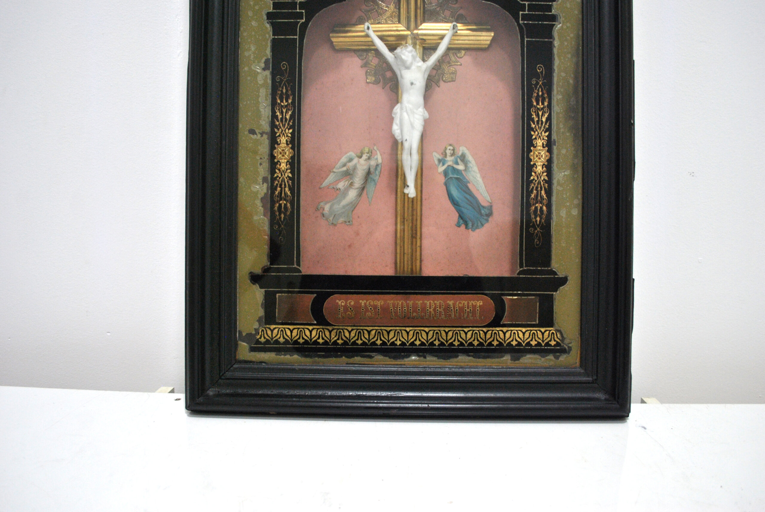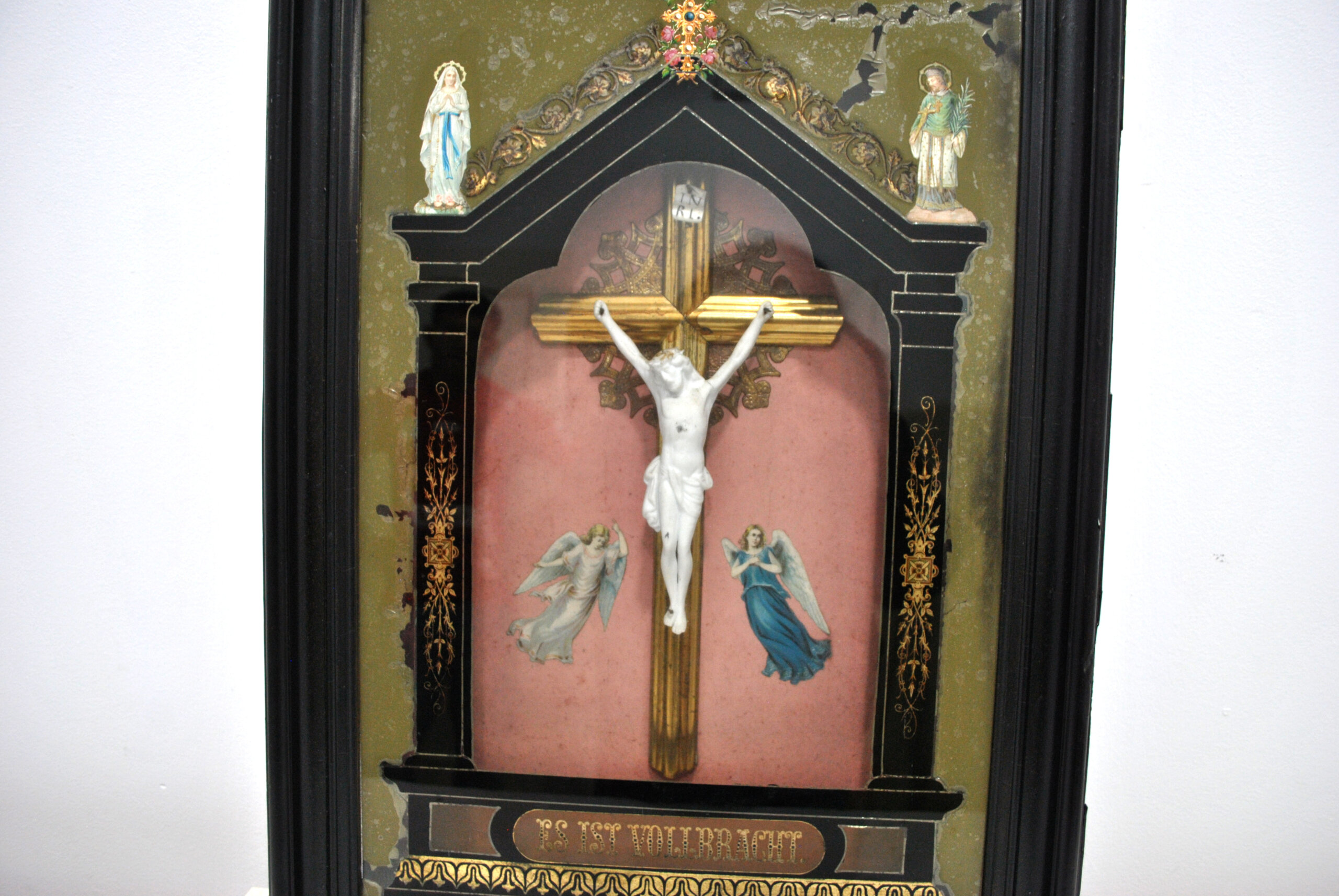 REF: 12419 – Antiguo y delicado relicario religioso enmarcado, representando a Cristo crucificado en una elegante composición tipo capilla, de gran valor devocional y decorativo.