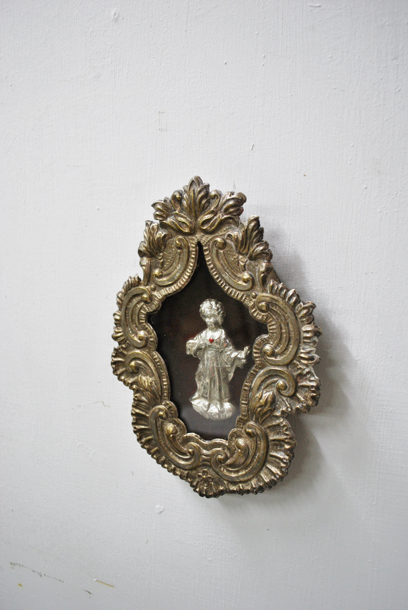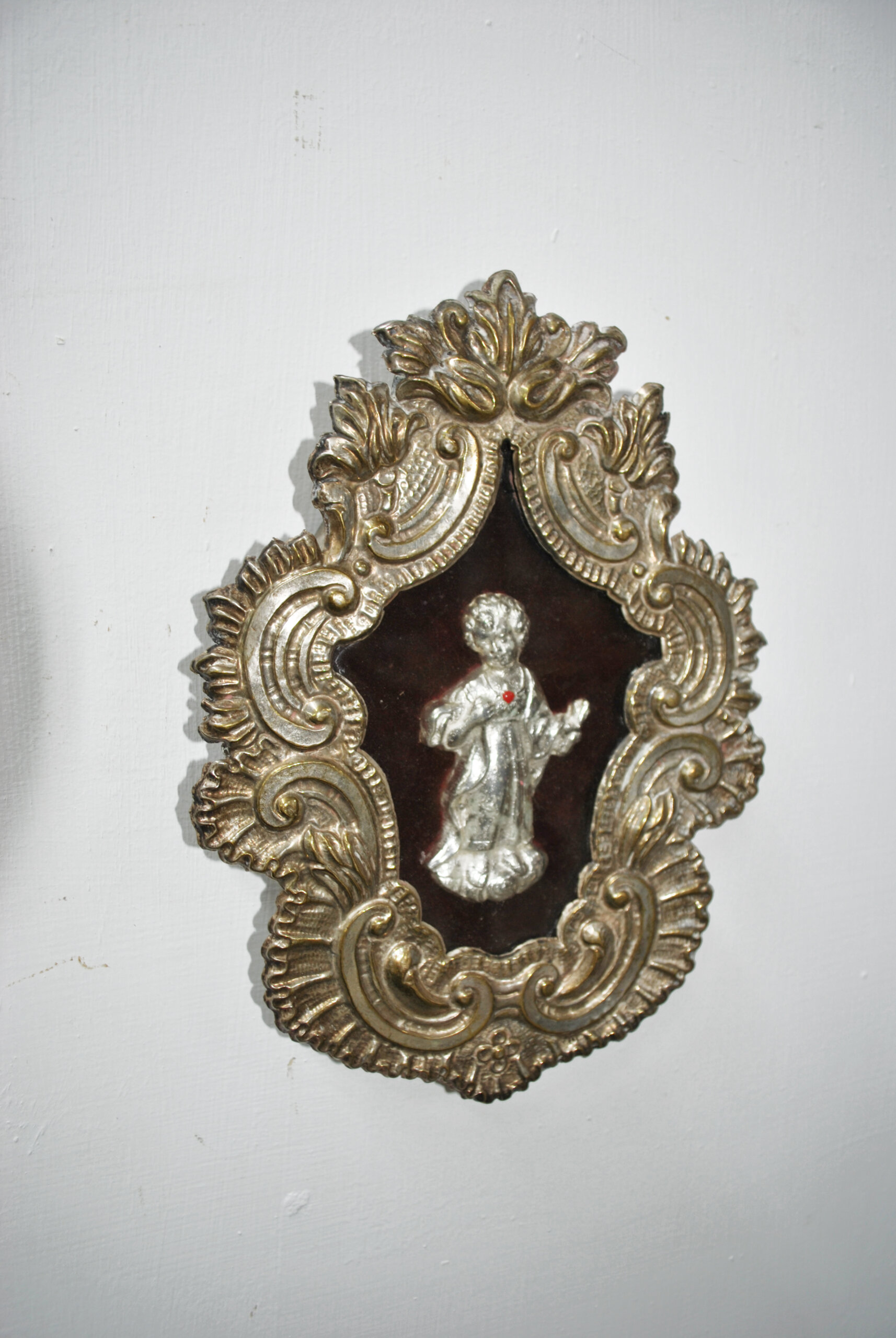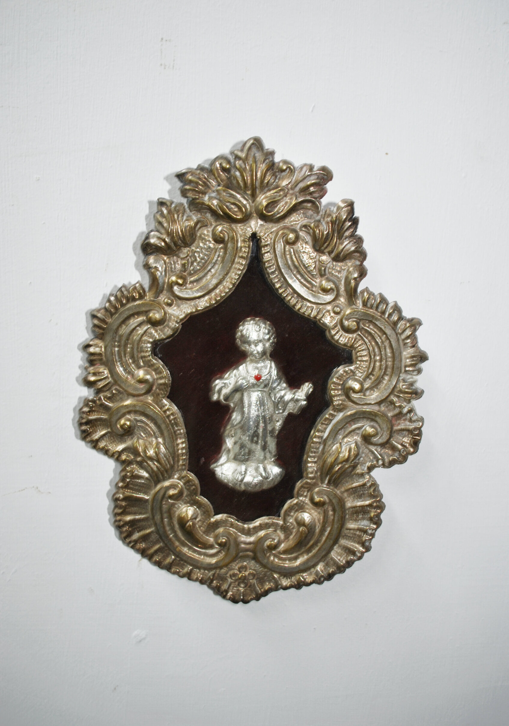 REF: 11954 – Precioso relicario antiguo con representación del Niño Jesús, realizada en relieve metálico sobre un fondo aterciopelado en tono burdeos profundo. El conjunto está enmarcado por un marco profusamente ornamentado en estilo barroco, con acabados dorados envejecidos que resaltan los detalles florales y volutas talladas. La figura central, finamente modelada, exhibe un pequeño corazón rojo en el pecho, símbolo del Sagrado Corazón de Jesús.