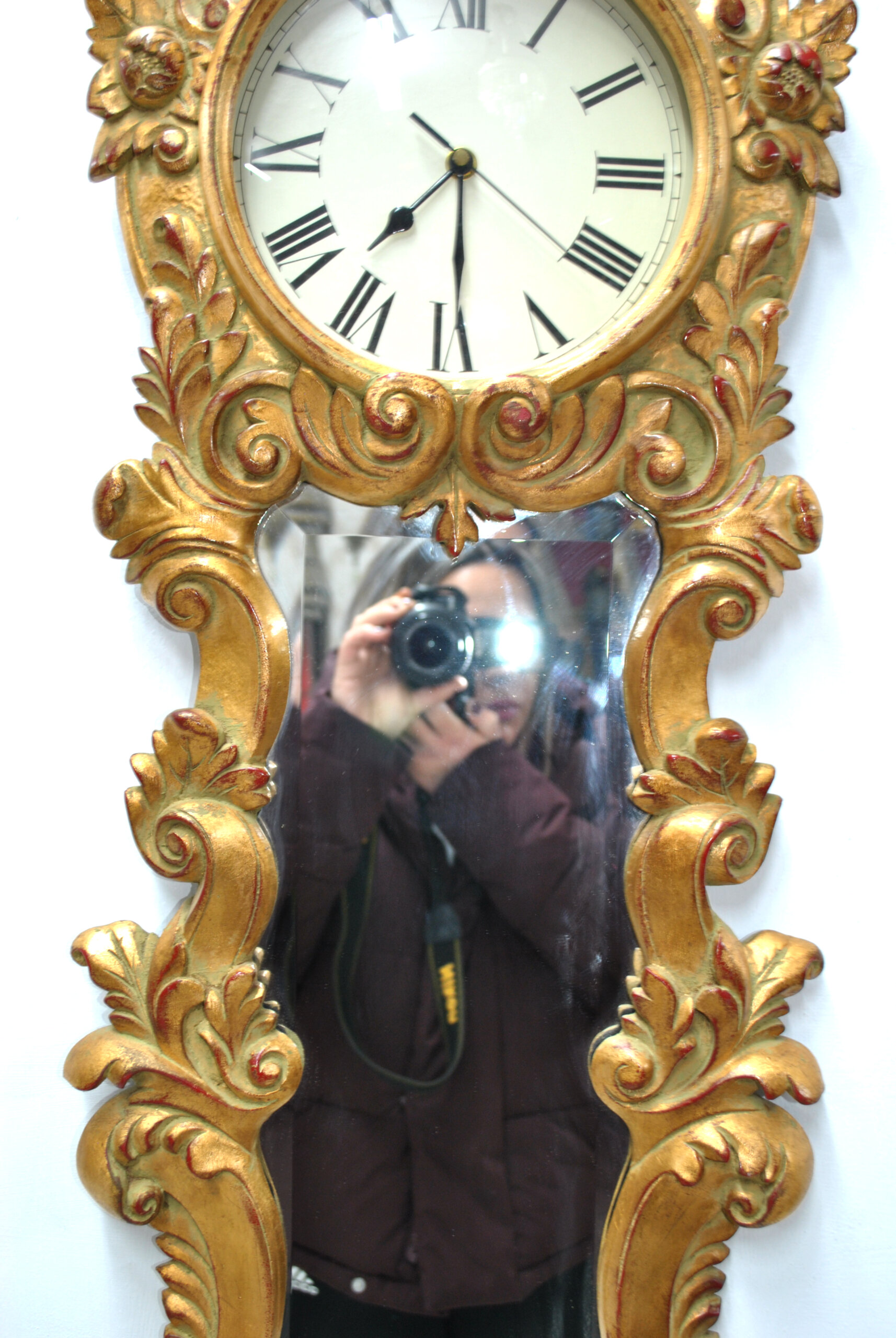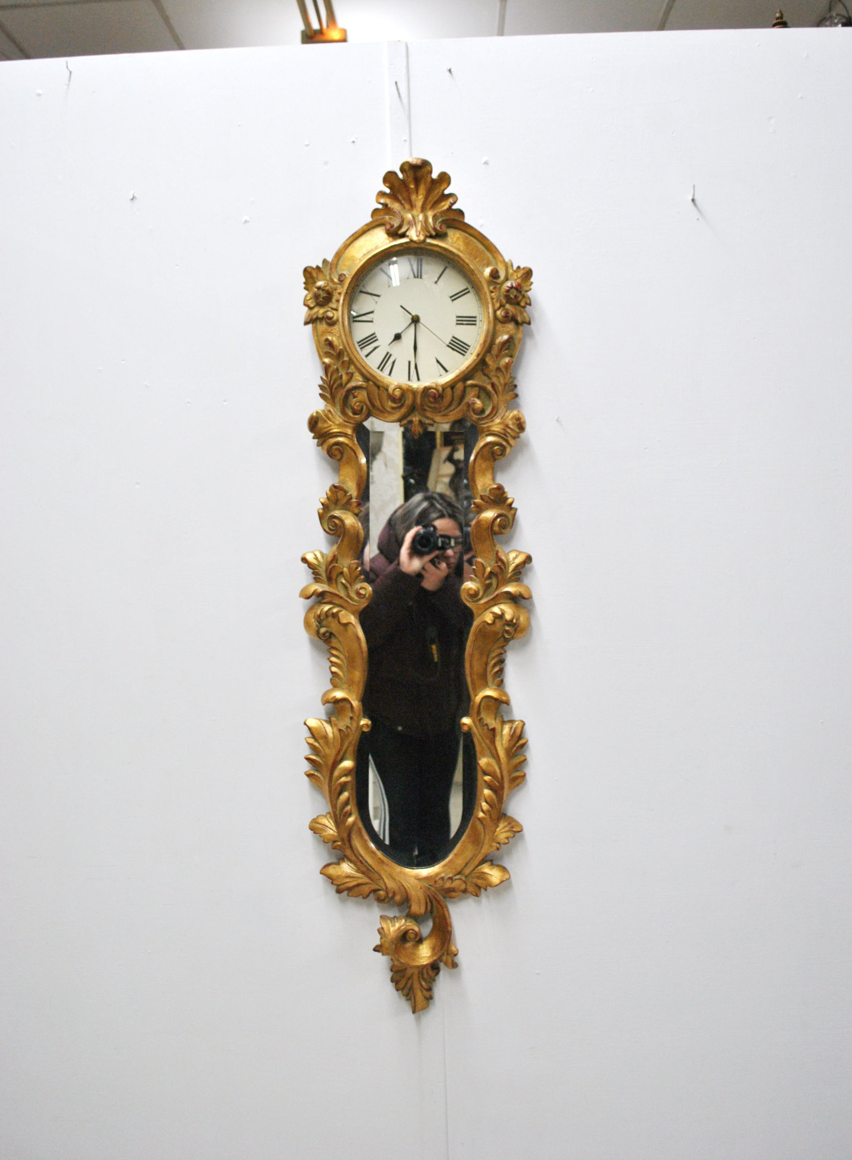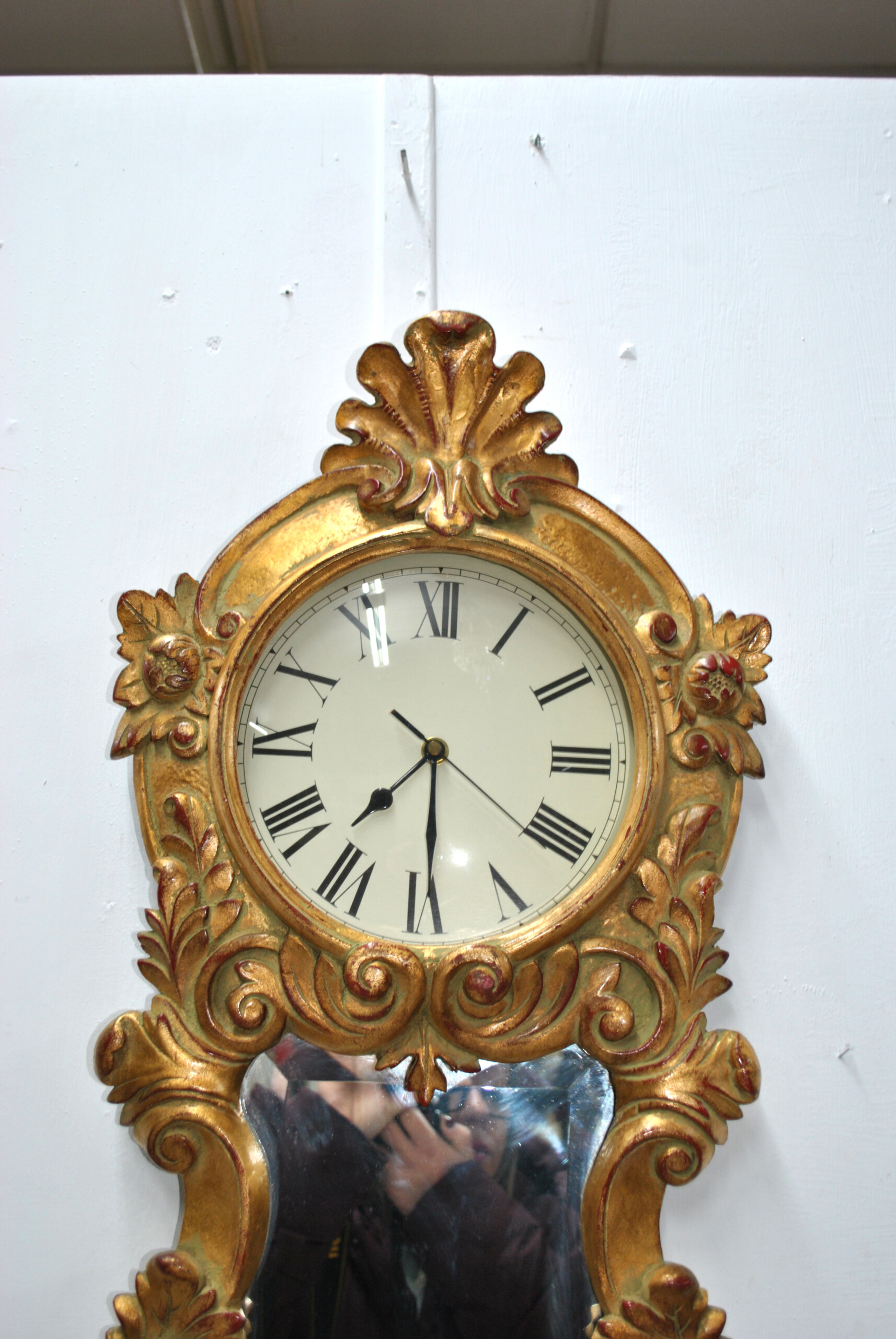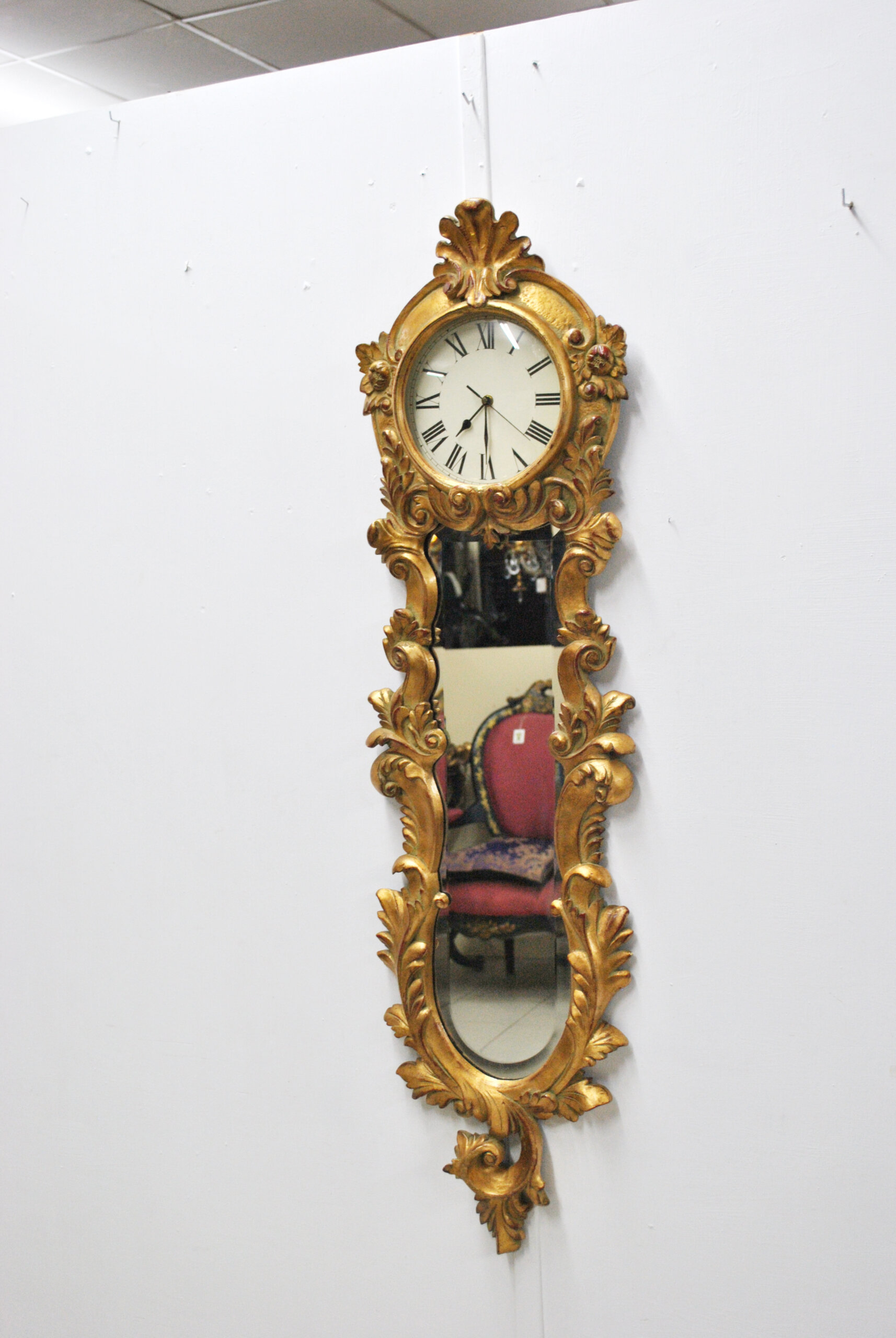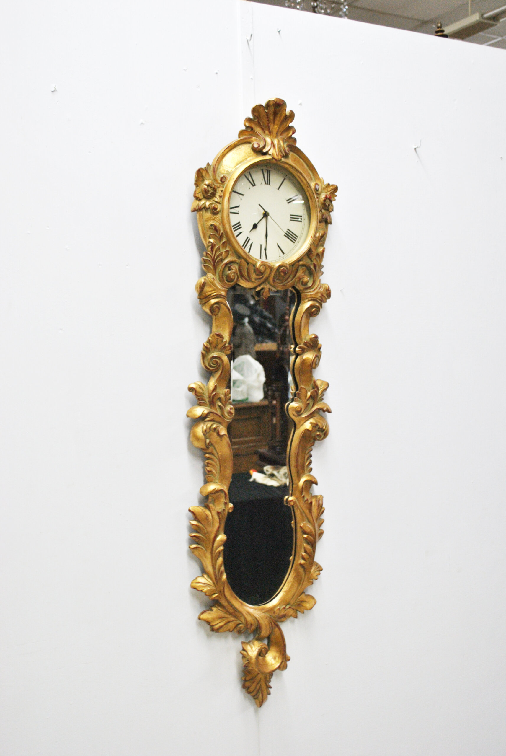 REF: 12038 – Reloj de pared con espejo de estilo clásico, ricamente tallado y dorado, de gran elegancia y presencia decorativa. La pieza presenta una estructura vertical con copete superior, marco profusamente ornamentado con roleos, hojas y motivos vegetales de inspiración barroca y rococó, todo ello acabado en pan de oro con pátina envejecida que realza sus volúmenes y relieve.