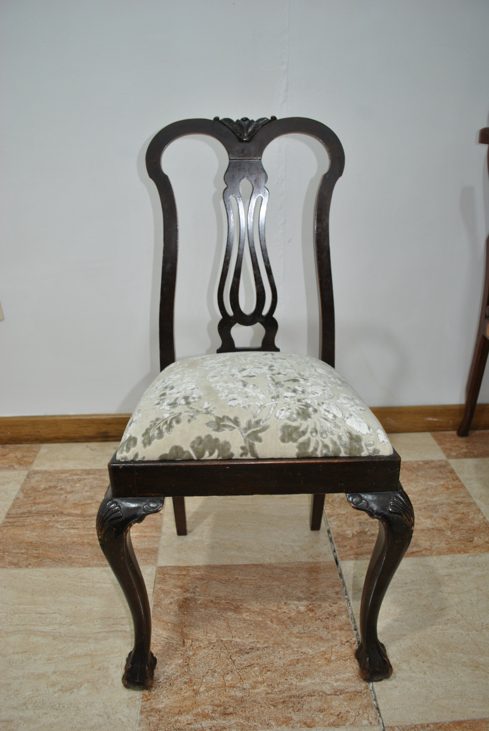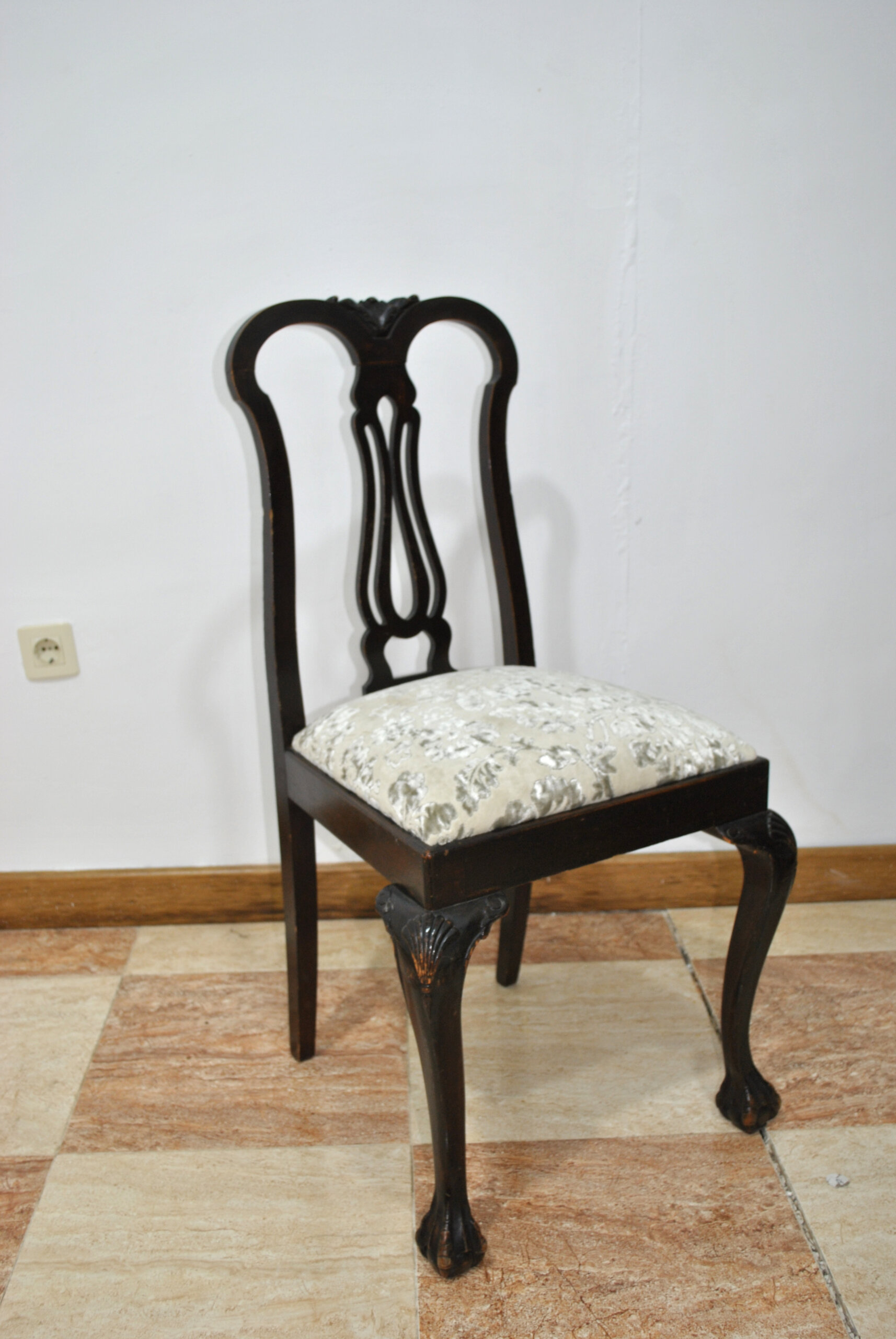 Las patas delanteras curvadas tipo cabriolé con terminación decorativa, inspiradas en el estilo Chippendale, aportan ligereza y distinción a la pieza. El asiento está tapizado en tela con motivo floral, proporcionando comodidad y un toque decorativo muy armonioso.
