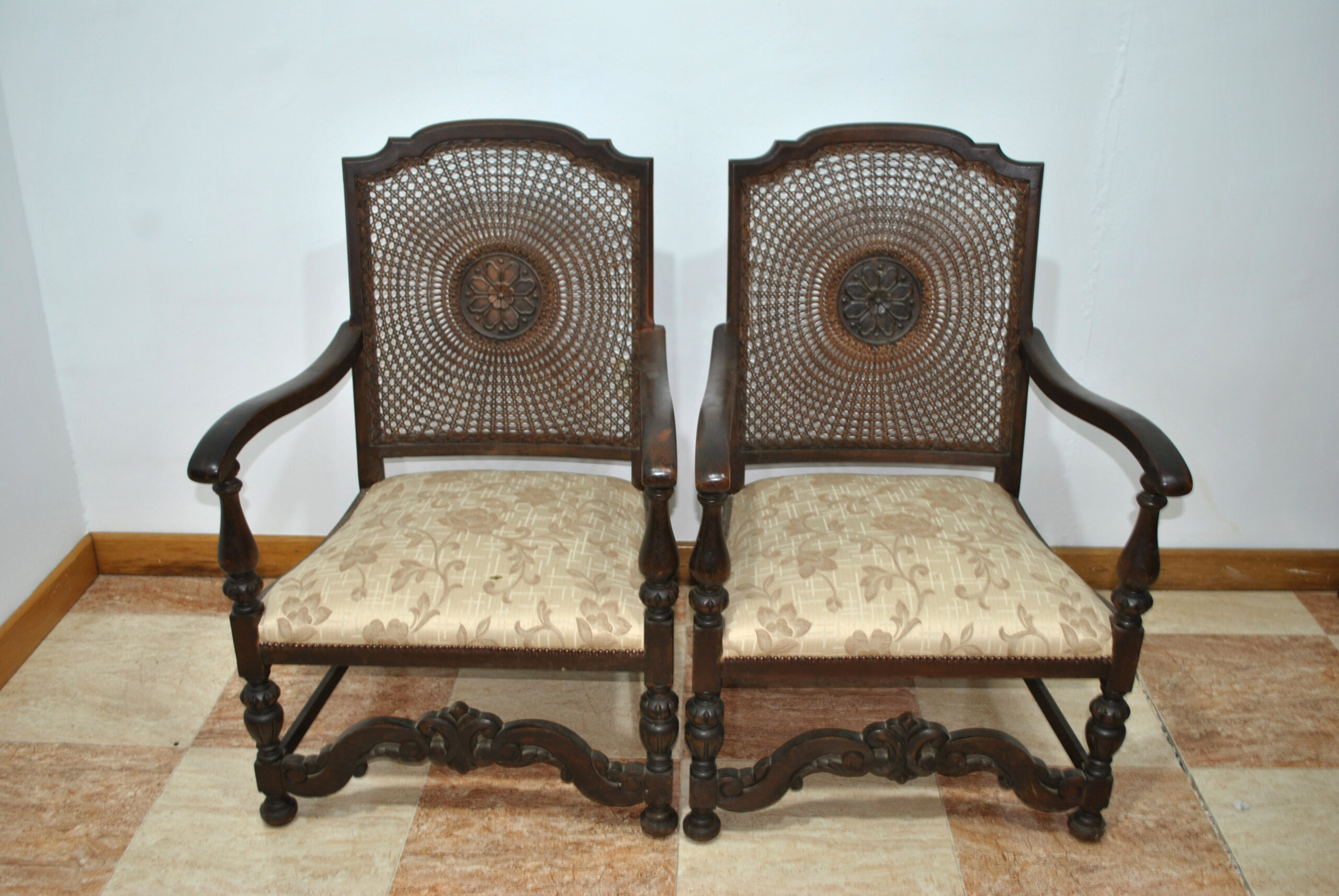 Los asientos están tapizados en tela de tono beige con motivos florales, cómodos y en armonía con el color cálido de la madera. Son piezas ideales tanto para un salón, despacho, recibidor o casa de campo, y encajan perfectamente en ambientes clásicos, rústicos o vintage.