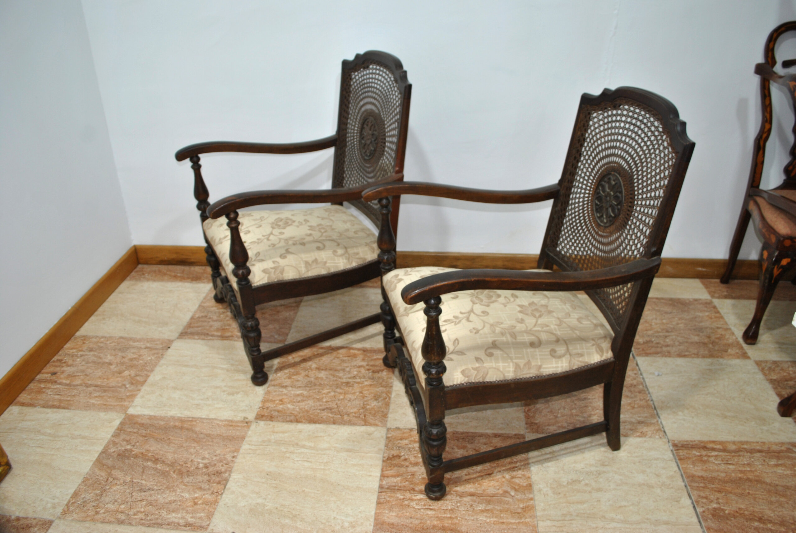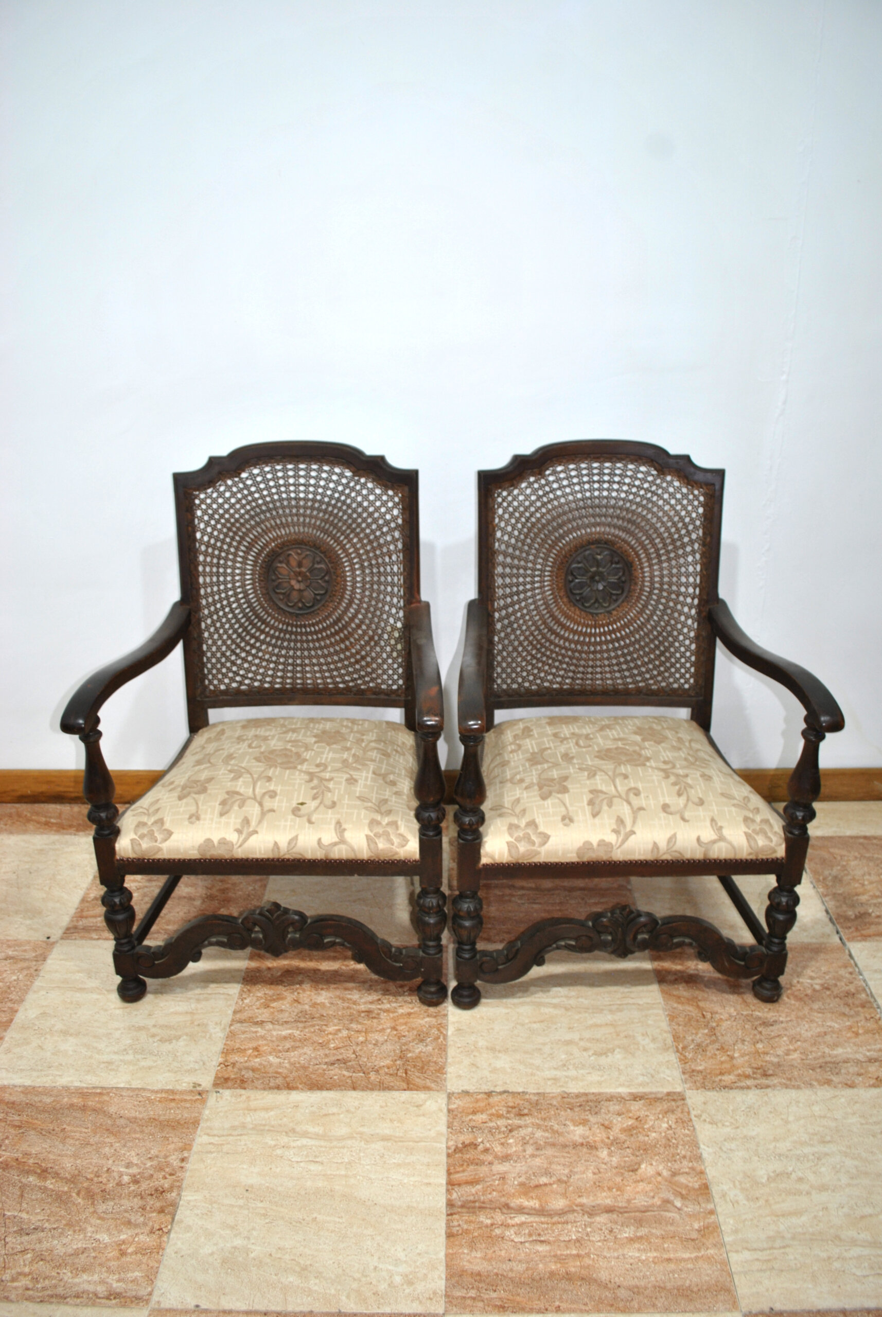 REF: 12250 – Elegante pareja de sillones antiguos de madera maciza, con respaldo de rejilla de ratán natural trenzado y un bonito medallón tallado en el centro que aporta carácter y distinción al conjunto. Presentan brazos curvados y patas torneadas unidas por una chambrana decorativa tallada, detalles que reflejan la calidad de su fabricación y su estilo clásico.
