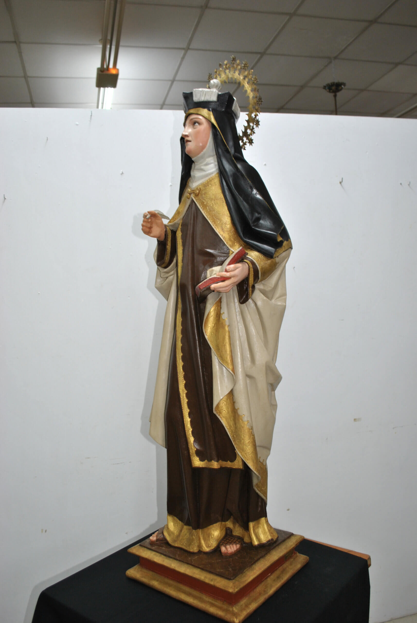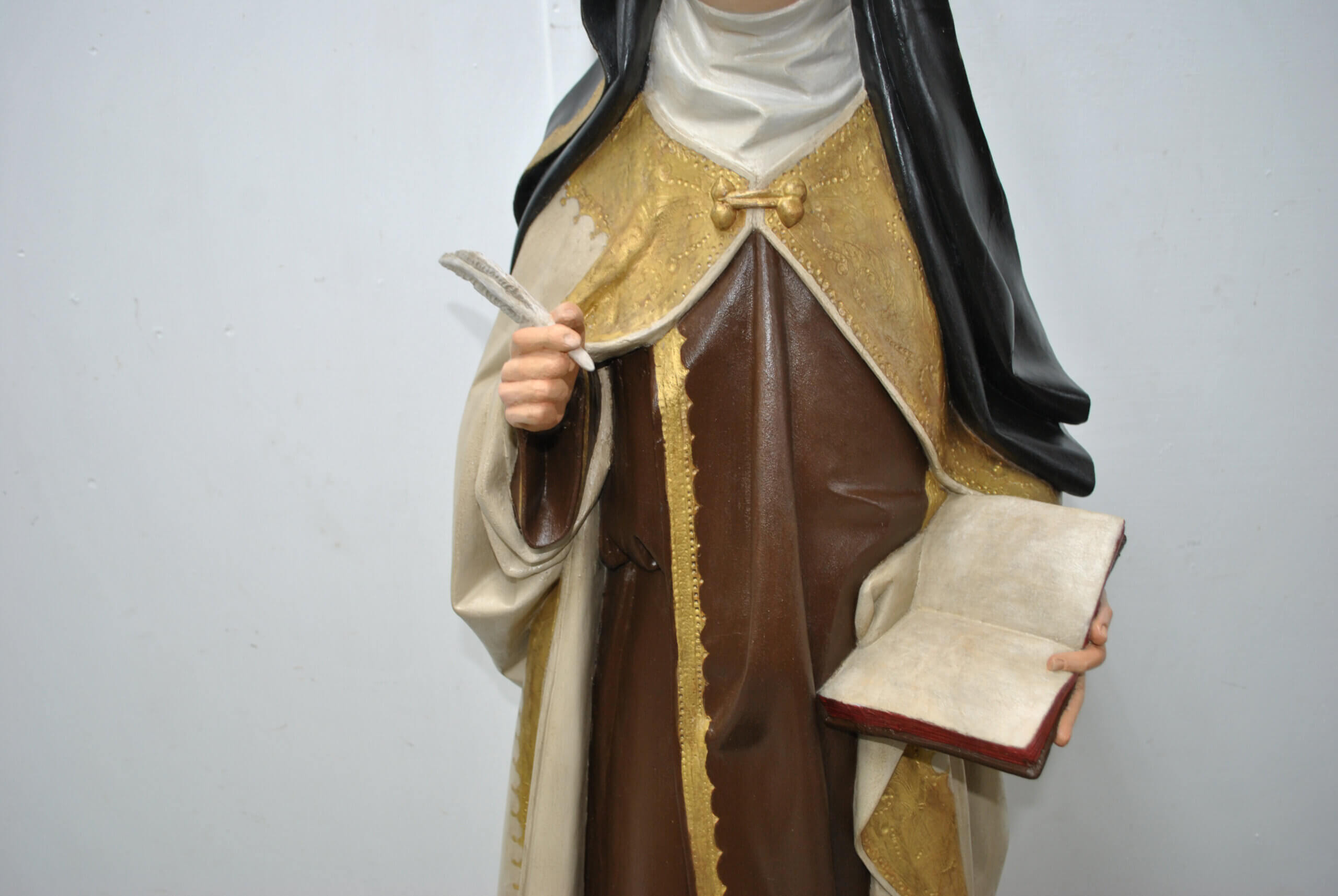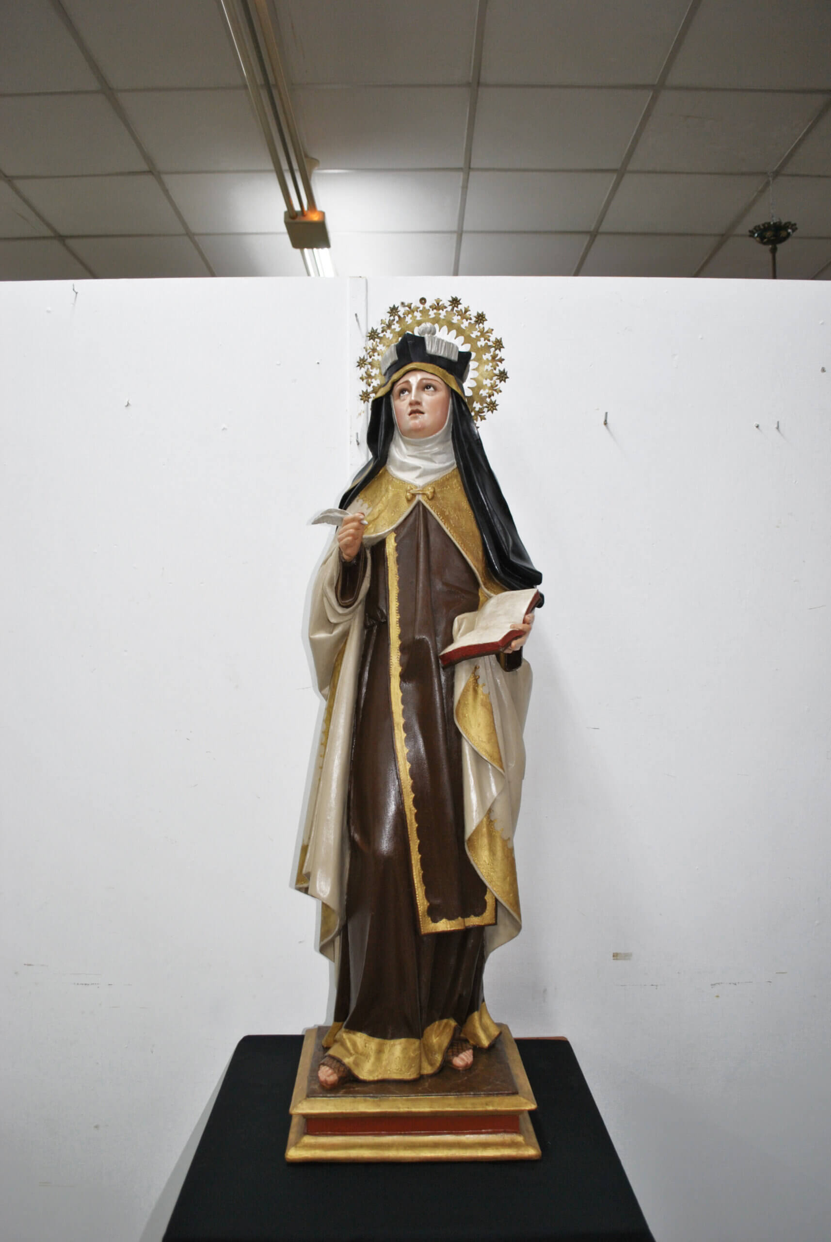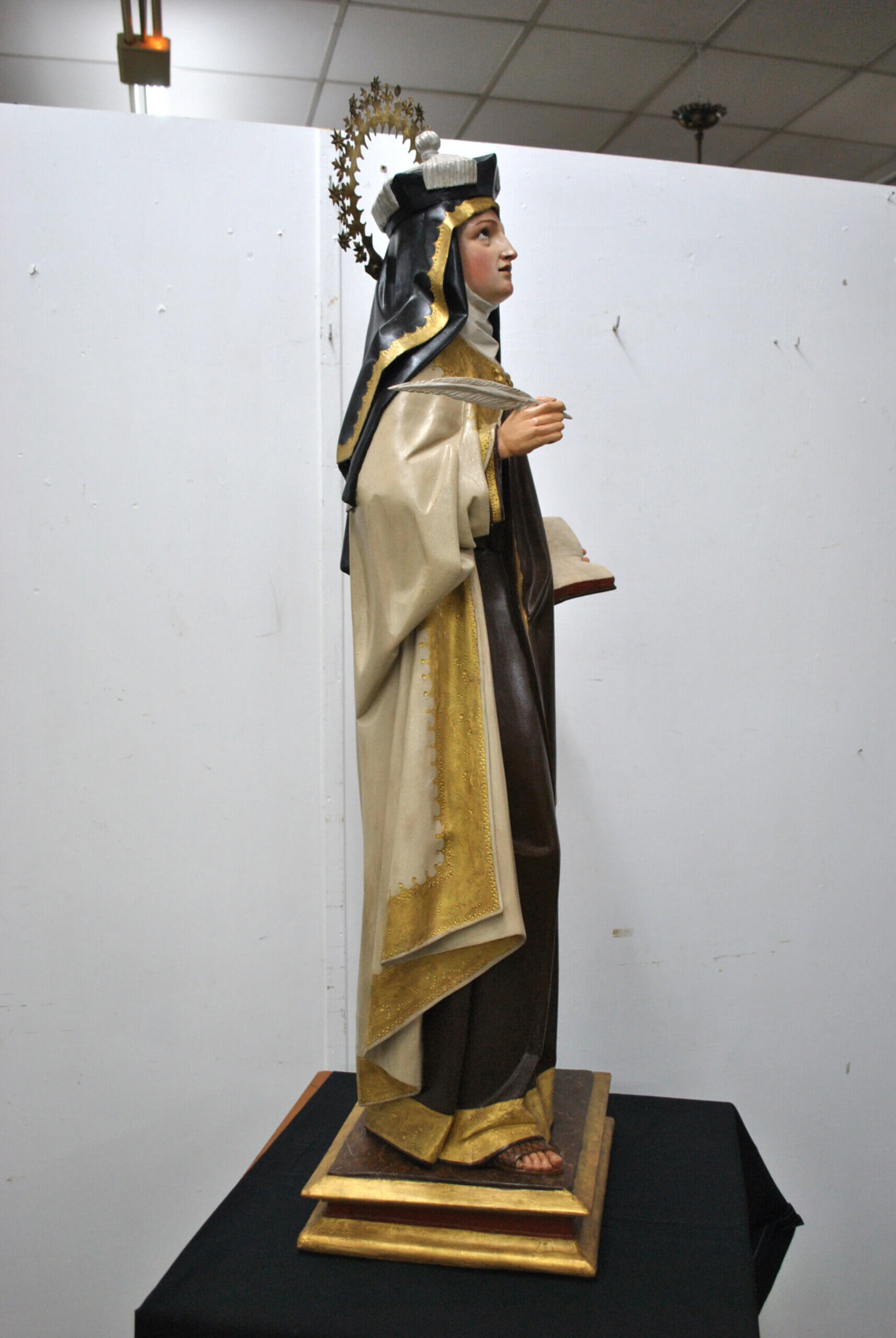 REF: PA-272 : Magnífica escultura religiosa en madera tallada y policromada, representando a Santa Teresa de Jesús, una de las grandes figuras del misticismo español. La santa aparece de pie sobre una base escalonada dorada, sosteniendo en su mano derecha una pluma, símbolo de su labor como escritora y Doctora de la Iglesia, y en la izquierda un libro abierto, alusivo a su obra espiritual.