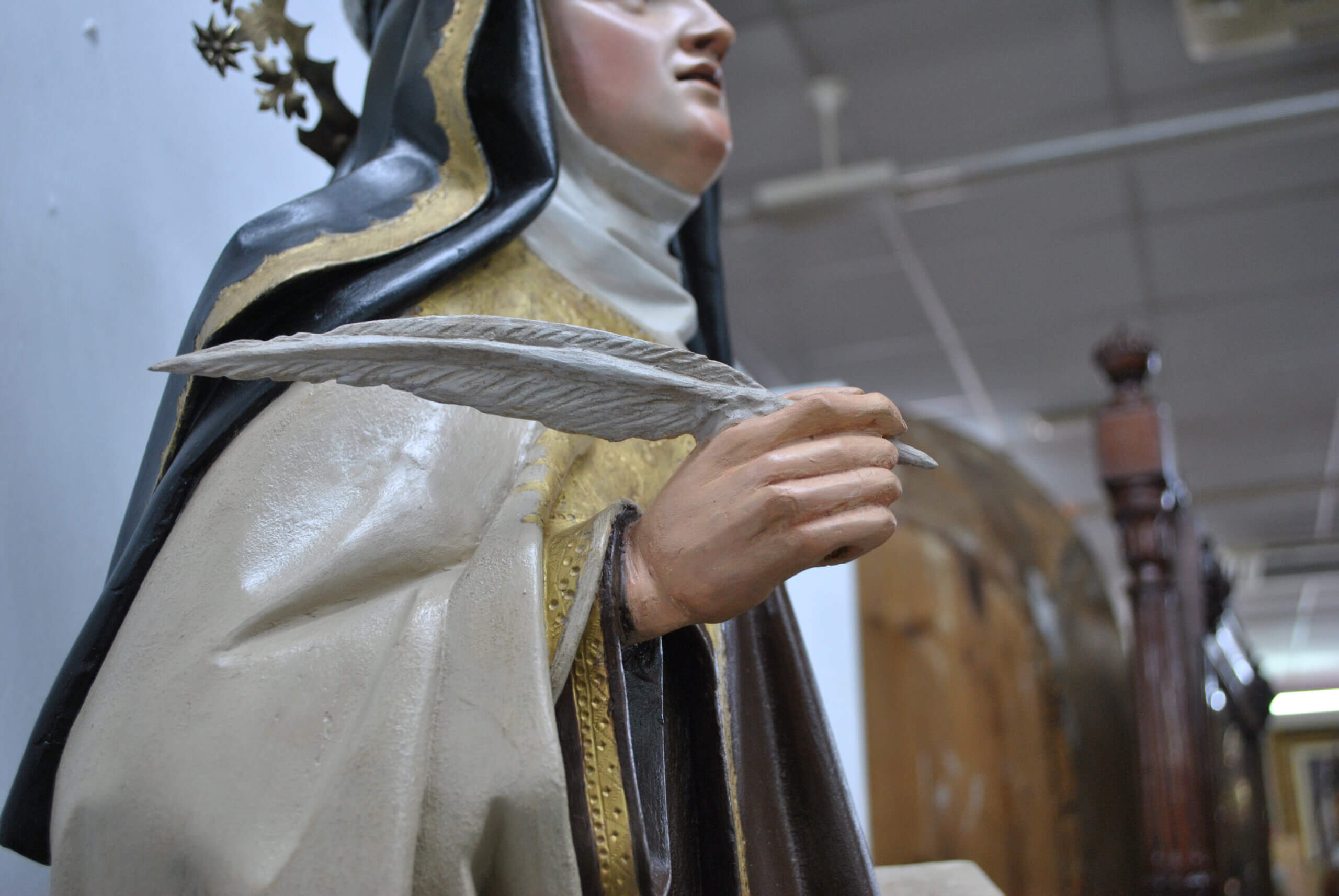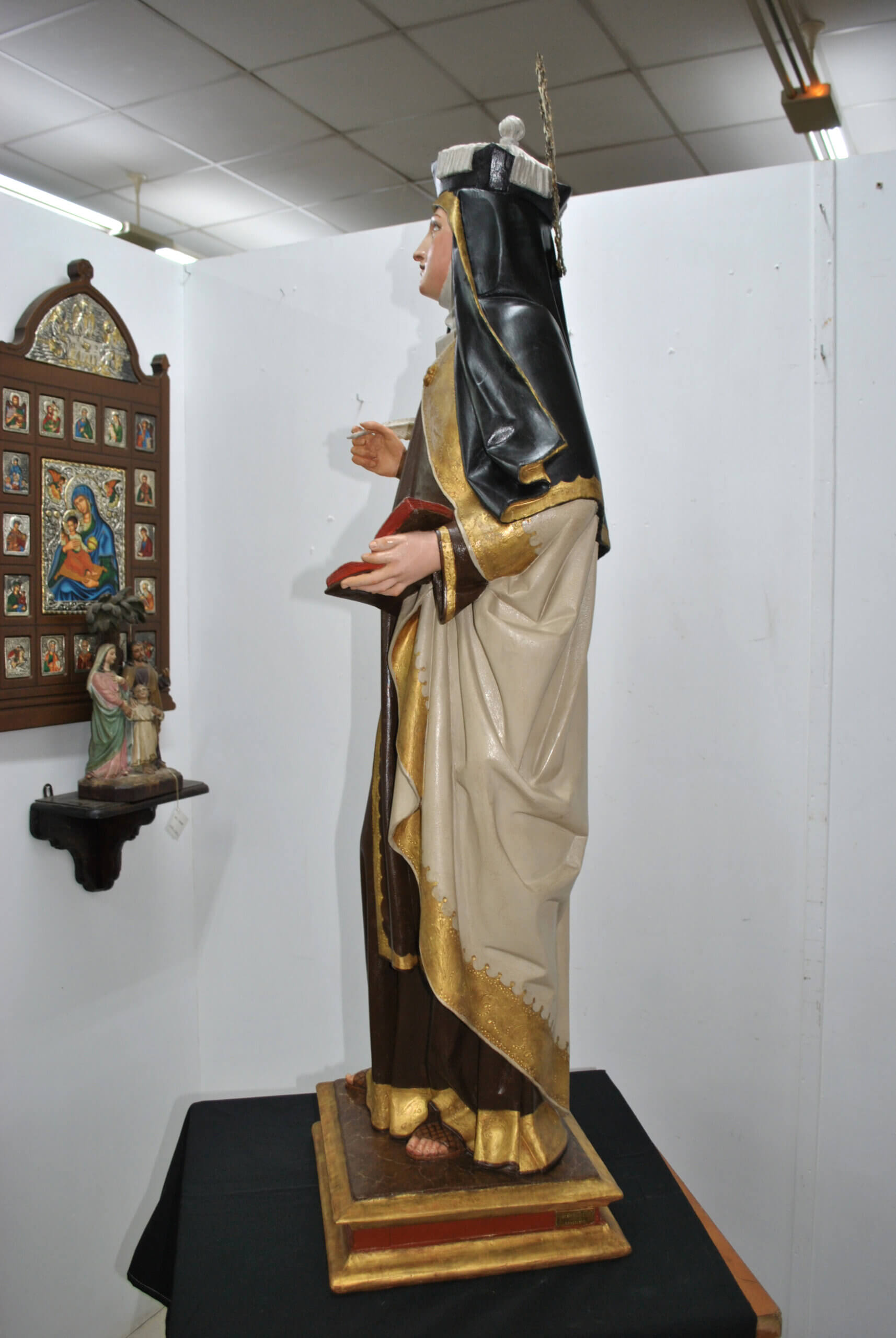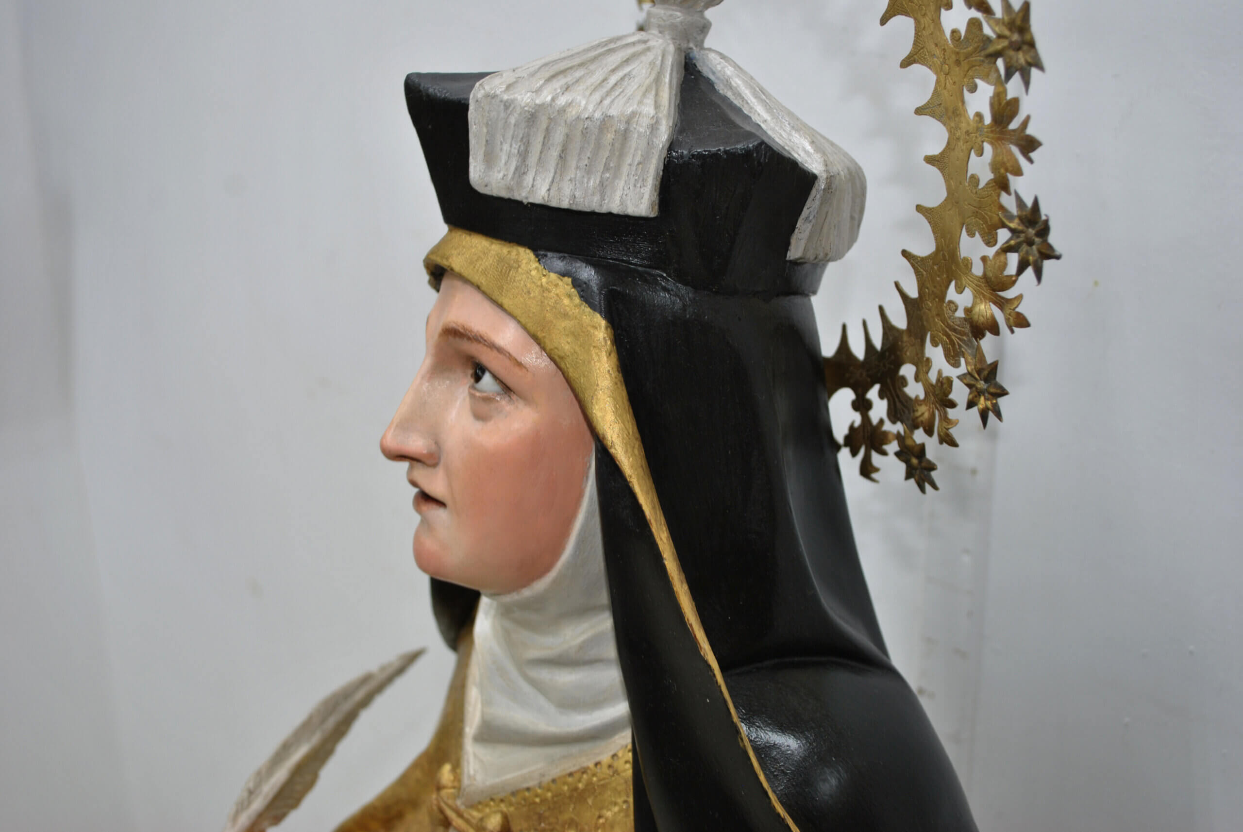 REF: PA-272 : Magnífica escultura religiosa en madera tallada y policromada, representando a Santa Teresa de Jesús, una de las grandes figuras del misticismo español. La santa aparece de pie sobre una base escalonada dorada, sosteniendo en su mano derecha una pluma, símbolo de su labor como escritora y Doctora de la Iglesia, y en la izquierda un libro abierto, alusivo a su obra espiritual.