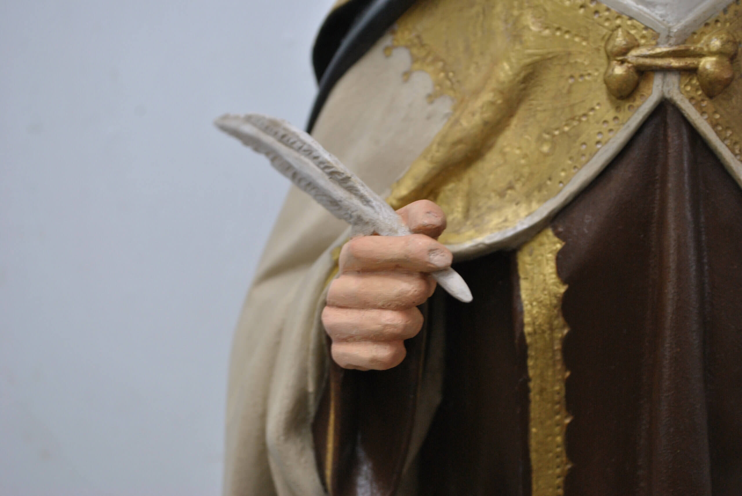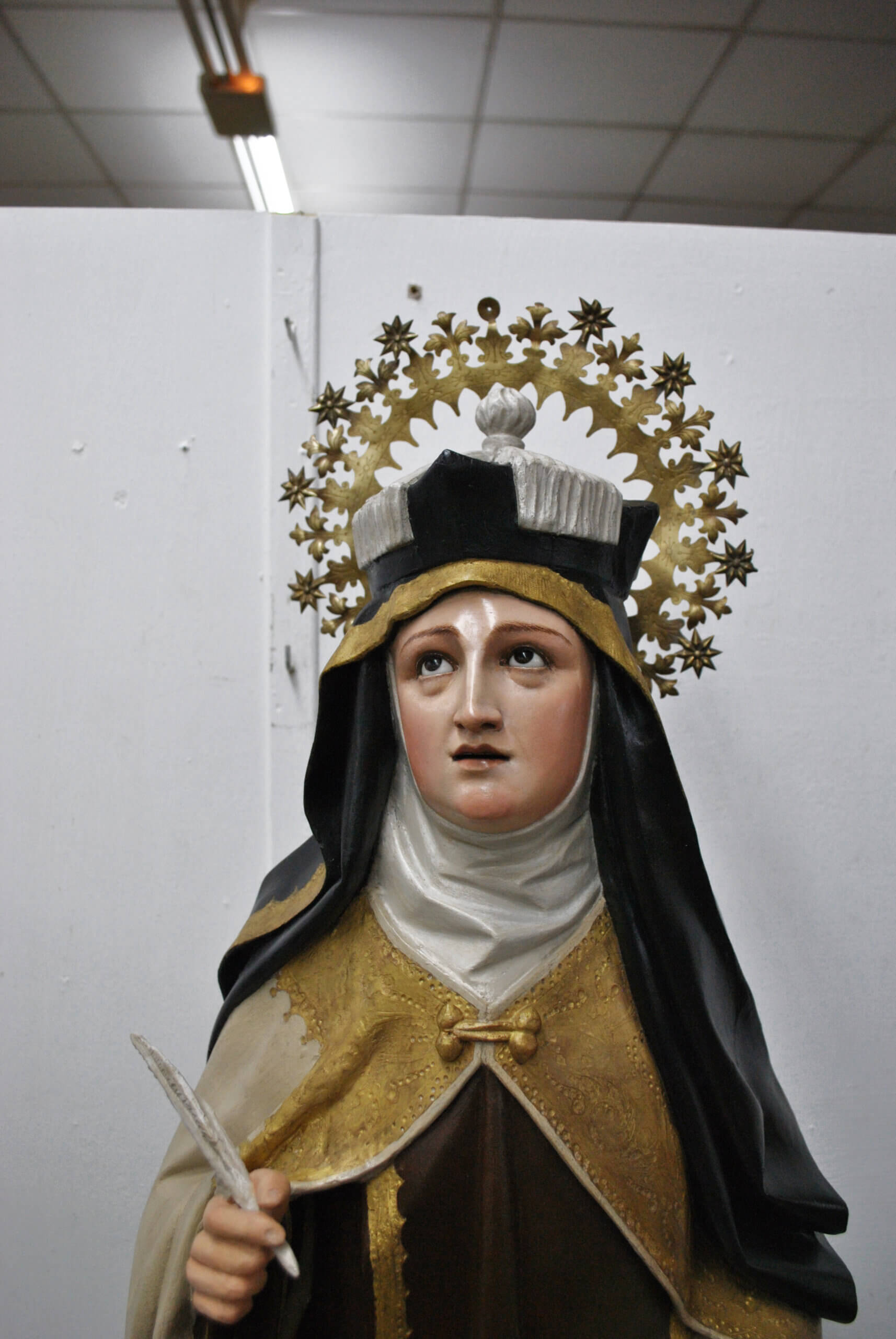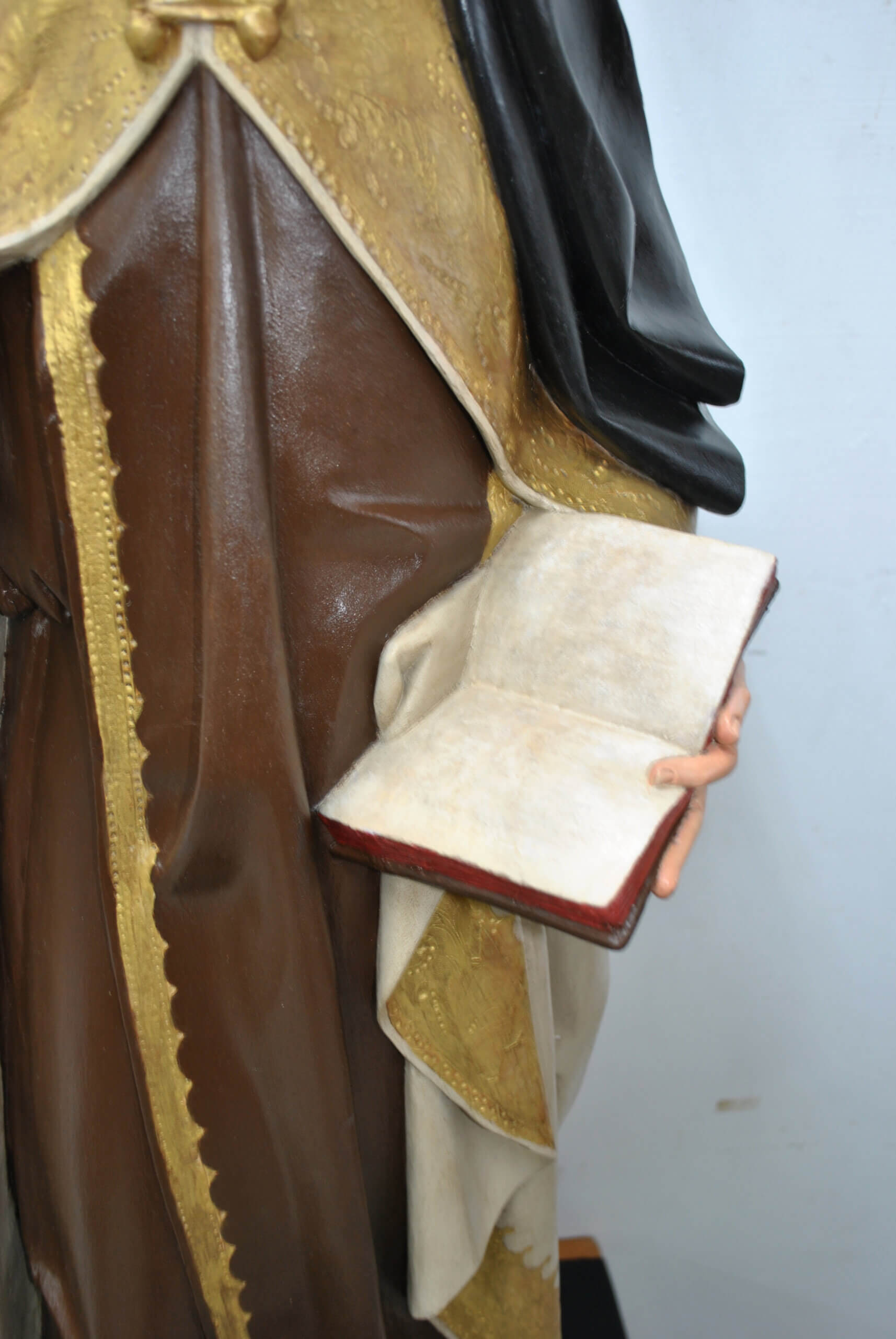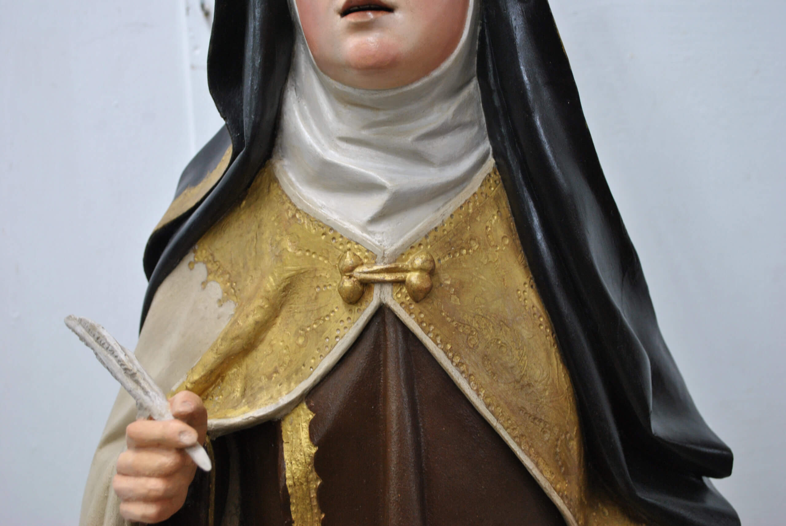 REF: PA-272 : Magnífica escultura religiosa en madera tallada y policromada, representando a Santa Teresa de Jesús, una de las grandes figuras del misticismo español. La santa aparece de pie sobre una base escalonada dorada, sosteniendo en su mano derecha una pluma, símbolo de su labor como escritora y Doctora de la Iglesia, y en la izquierda un libro abierto, alusivo a su obra espiritual.