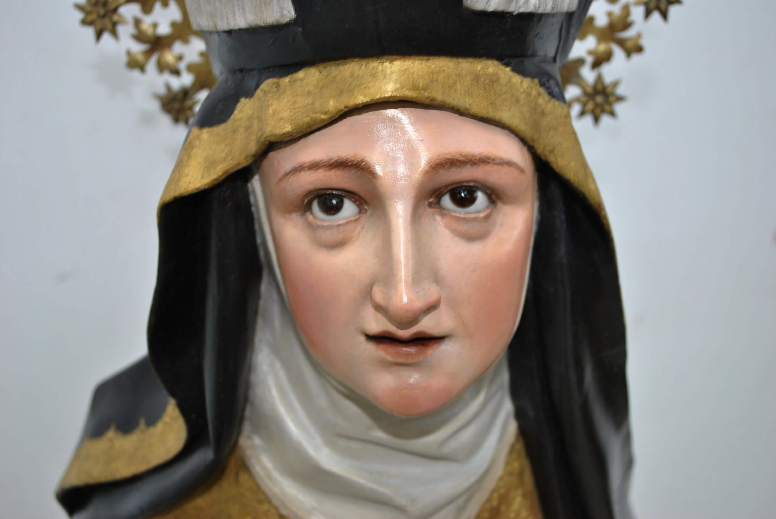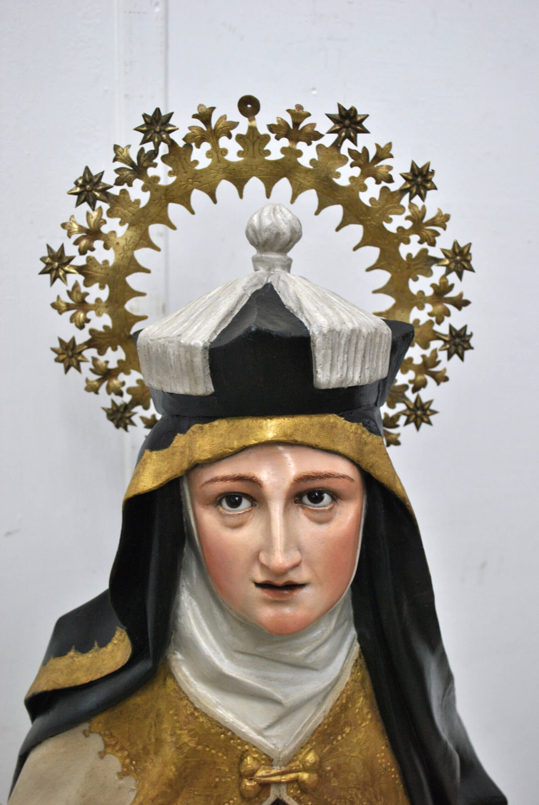 El rostro, de expresión serena y devota, denota una excelente calidad escultórica, con una policromía cuidada y naturalista. La imagen luce el hábito carmelita tradicional en tonos marrones, marfil y dorados, con detalles finamente estofados y una aureola de metal dorado calada con motivos estrellados.