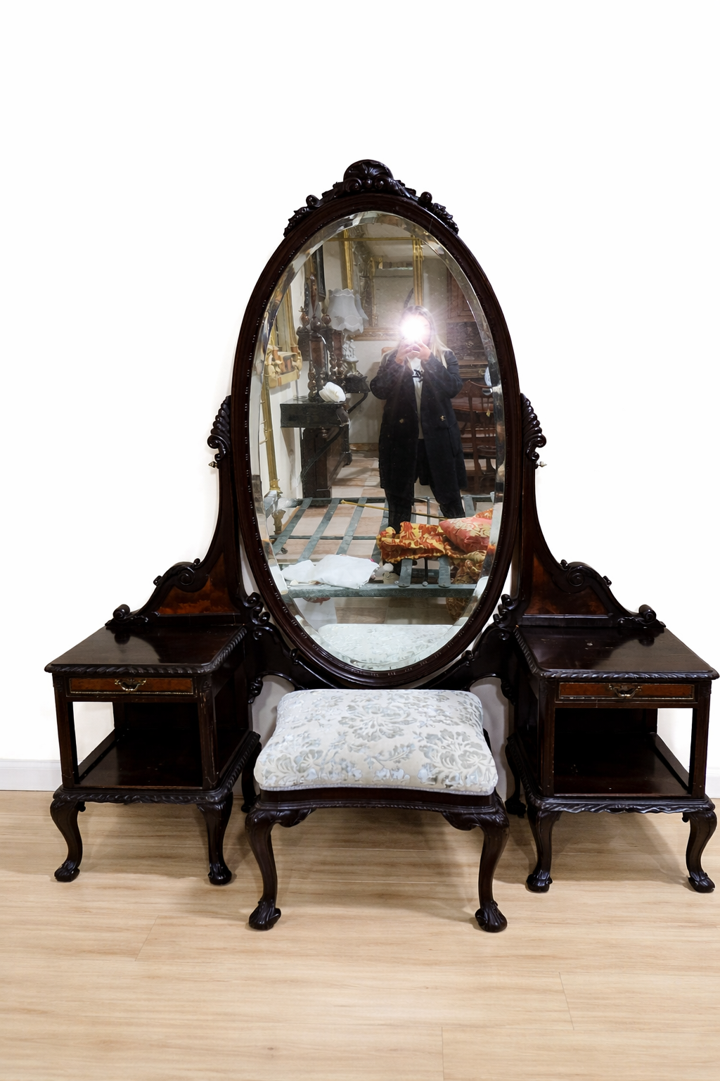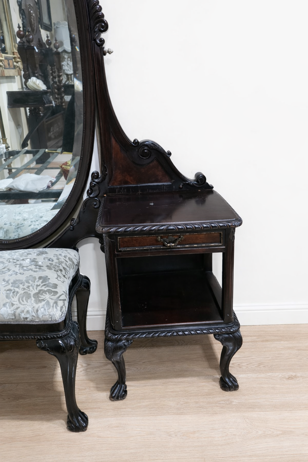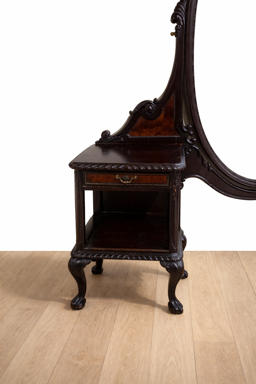 REF: 12282 – Elegante tocador antiguo de estilo Reina Ana con patas Chippendale, realizado en madera con una bonita terminación oscura que resalta sus tallas y formas clásicas. La pieza destaca por su gran espejo ovalado basculante, enmarcado por una estructura decorada con volutas y detalles tallados de inspiración inglesa.