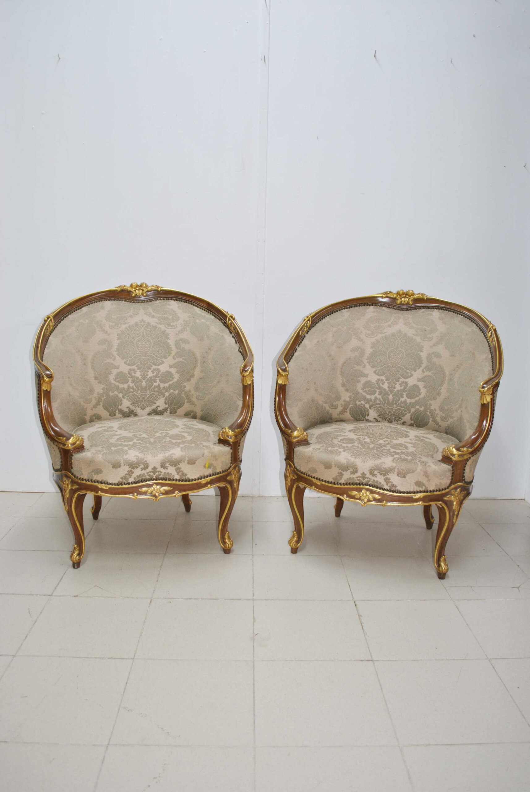 REF: 11673 – Magnífico juego de sillones antiguos estilo Luis XV, fabricados en madera finamente tallada con detalles dorados en relieves de flores, rocallas y hojas de acanto. El tapizado es de tela damasco en color beige con elegantes motivos vegetales en tonos verdes y grises, conservando su estructura firme y estable. El dorado resalta sobre la madera oscura, aportando un aire distinguido y clásico a cualquier espacio. El estado general es bueno, con algunas señales de uso y pátina natural acorde a su antigüedad, especialmente en el asiento del sofá, sin afectar su funcionalidad ni presencia decorativa.