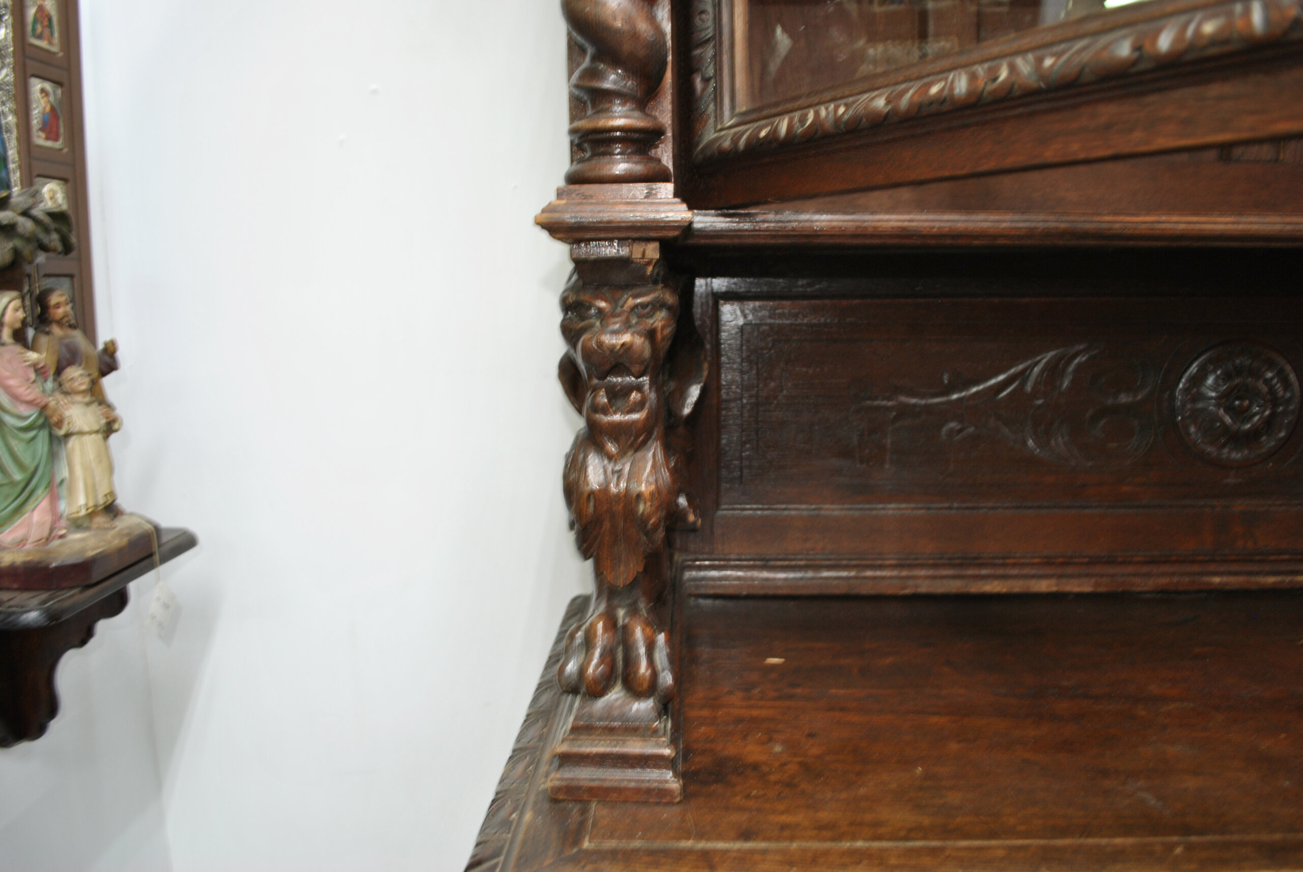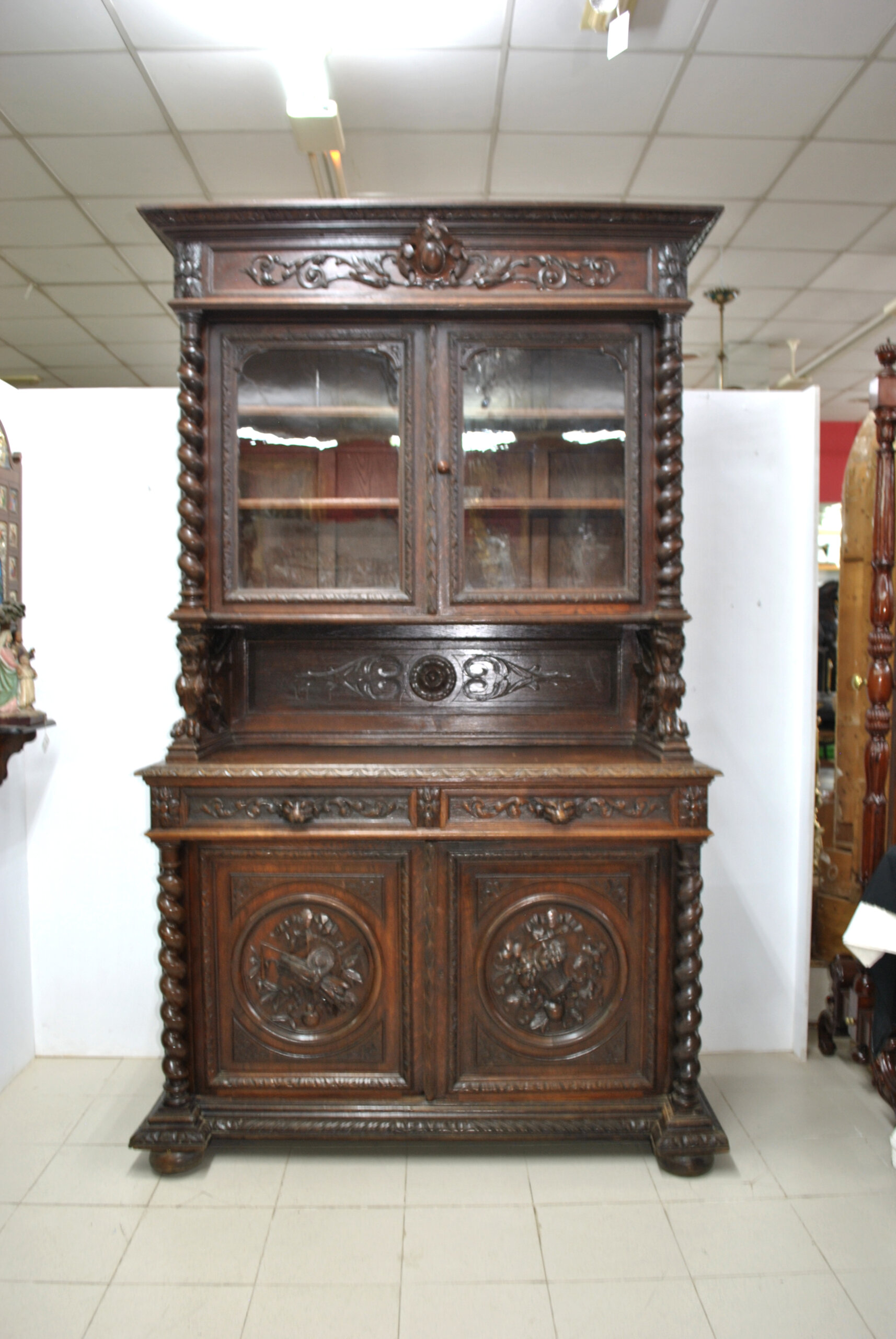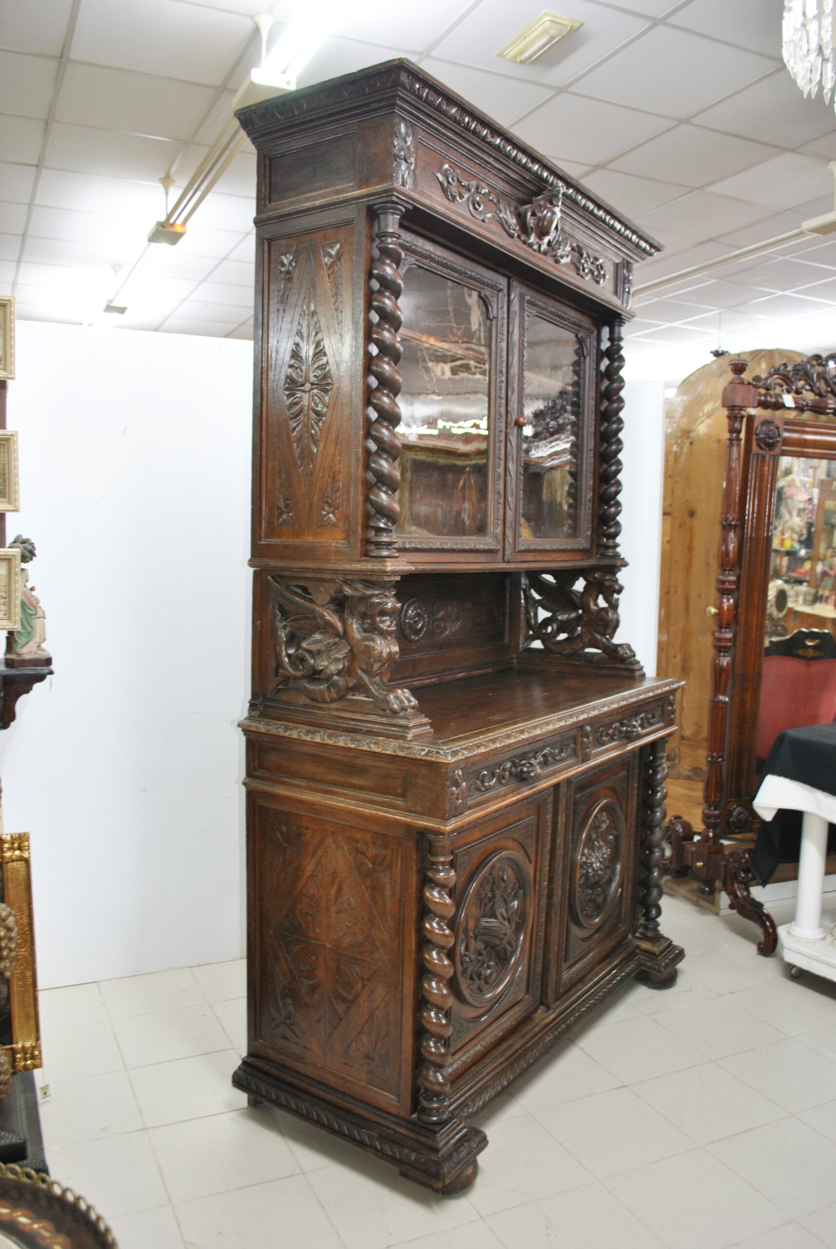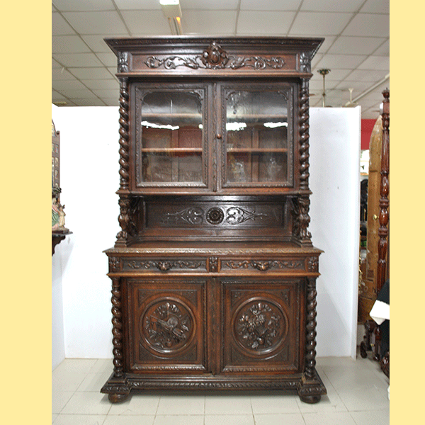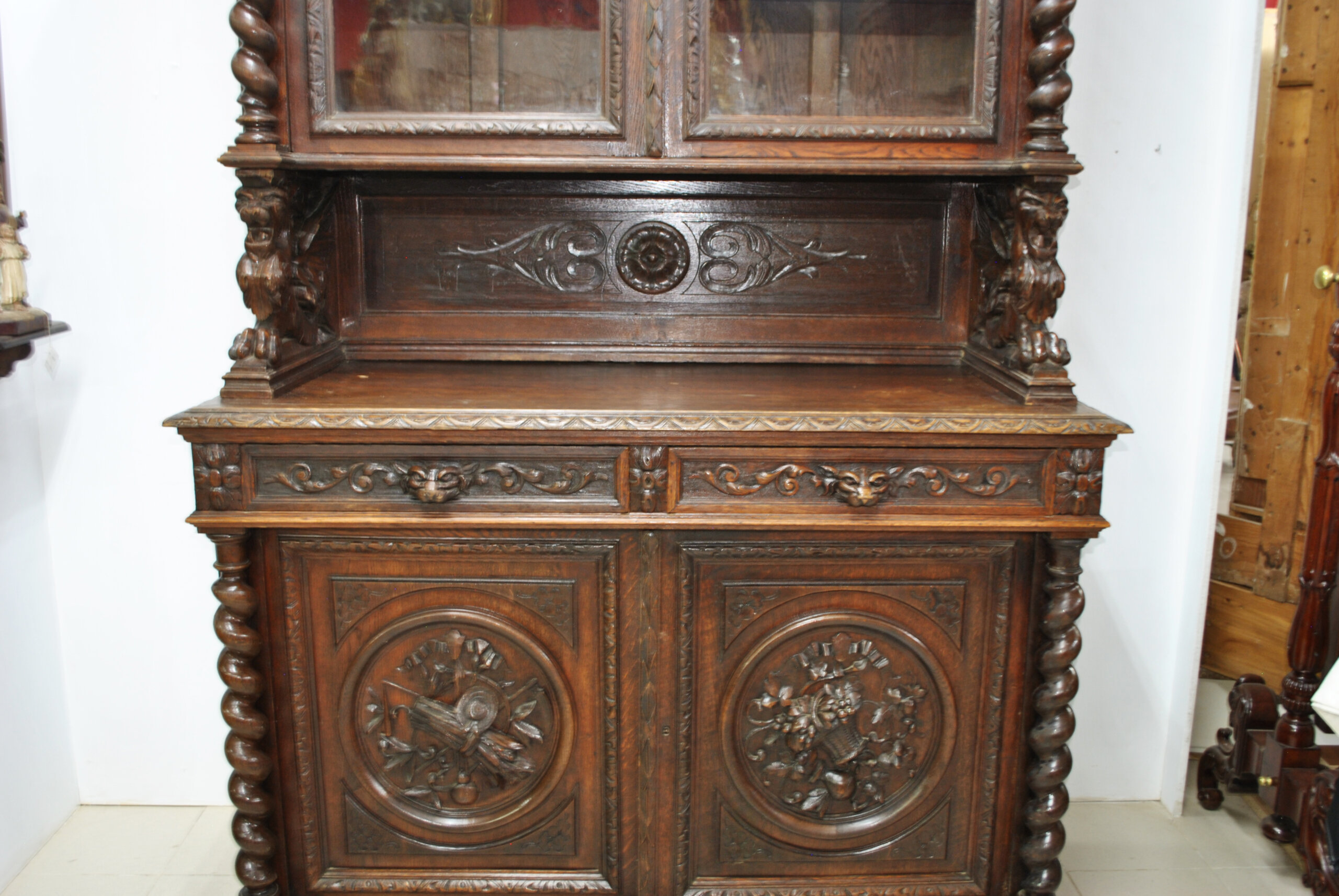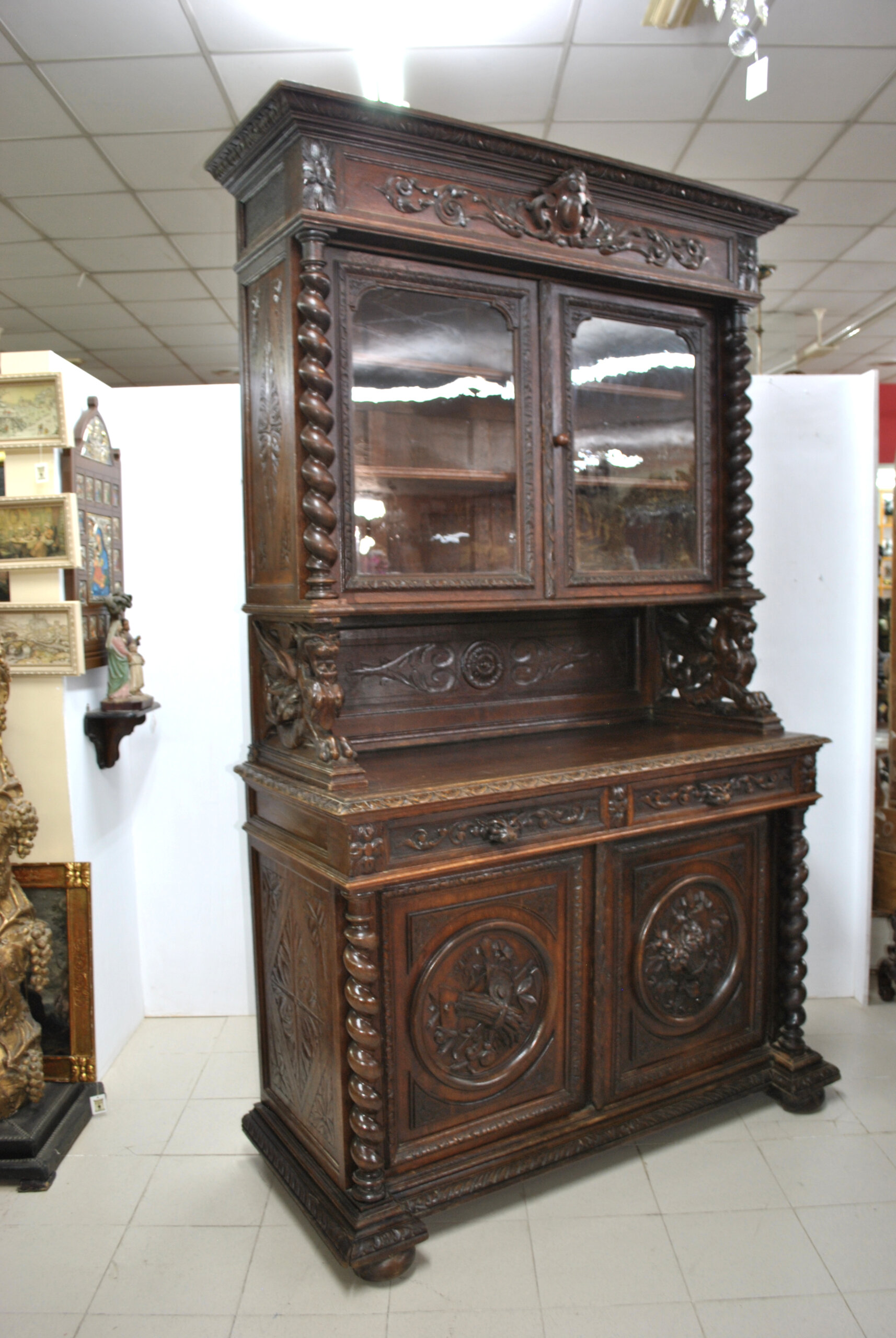 REF: 11970 – Precioso trinchero, aparador o vitrina de estilo renacimiento tallado en madera de roble macizo, de exquisita elaboración artesanal y gran presencia decorativa. La parte superior cuenta con dos puertas acristaladas con estantes interiores, enmarcadas por elegantes columnas salomónicas talladas a mano y rematadas con una cornisa de abundante ornamentación vegetal y motivos de rocalla. En la zona intermedia se aprecia una repisa de apoyo y un friso profusamente labrado con relieves florales y cartelas. La parte inferior dispone de dos amplios cajones y dos puertas con medallones circulares en relieve que representan escenas alegóricas de instrumentos y flores, flanqueadas también por columnas de cuidada factura. Destacan los detalles escultóricos en los laterales, con figuras fantásticas de grifos finamente tallados, así como los paneles laterales con decoración geométrica y vegetal.