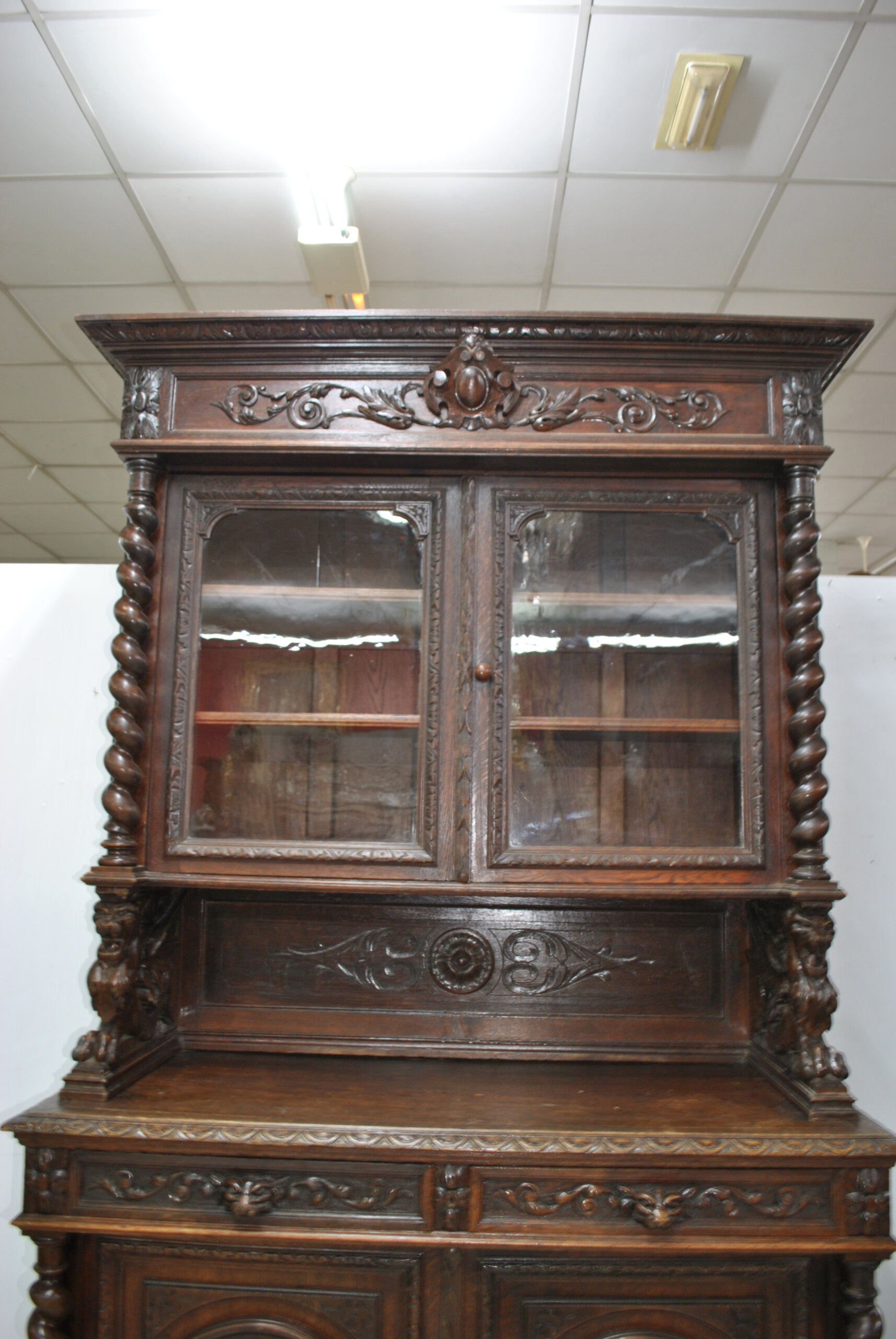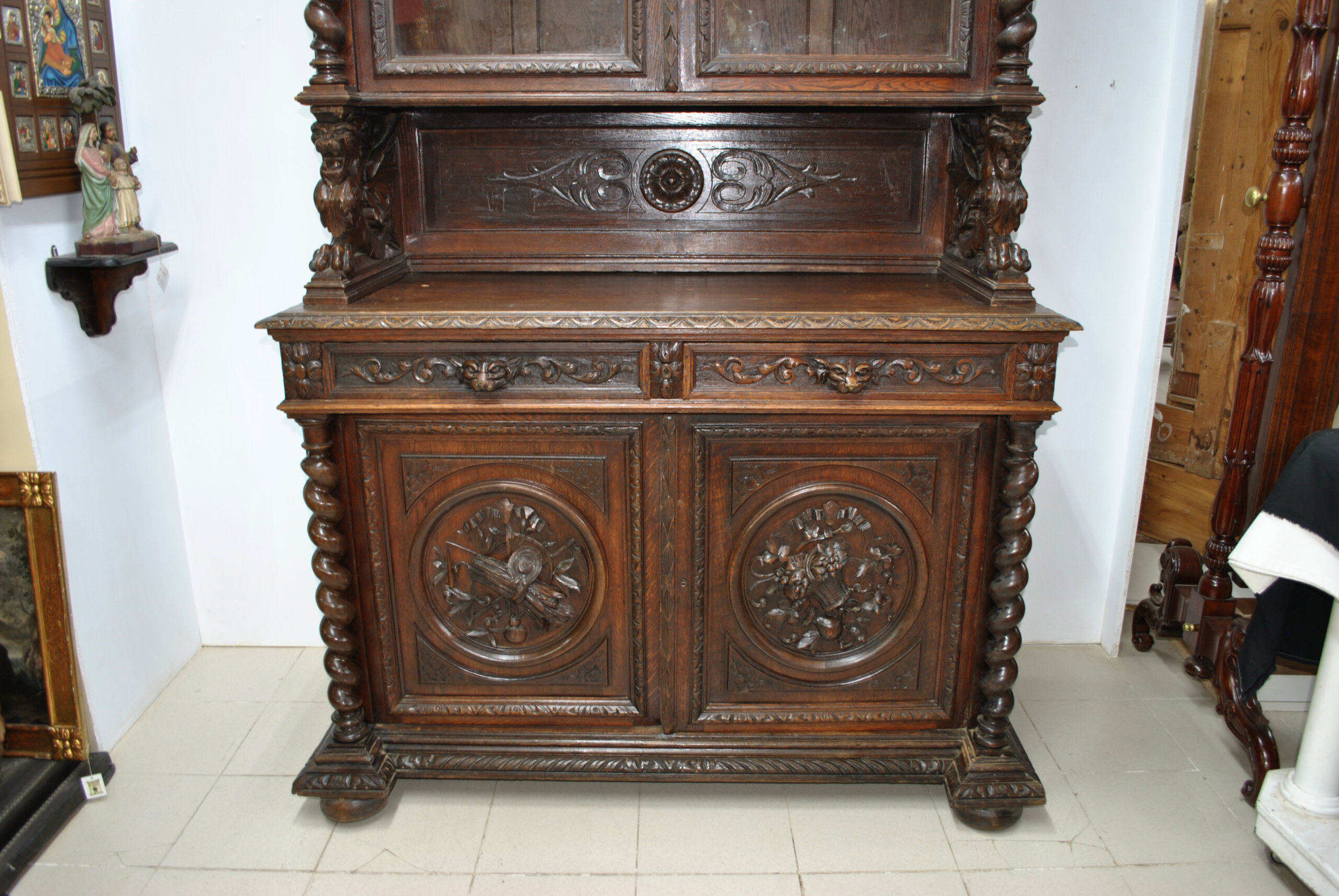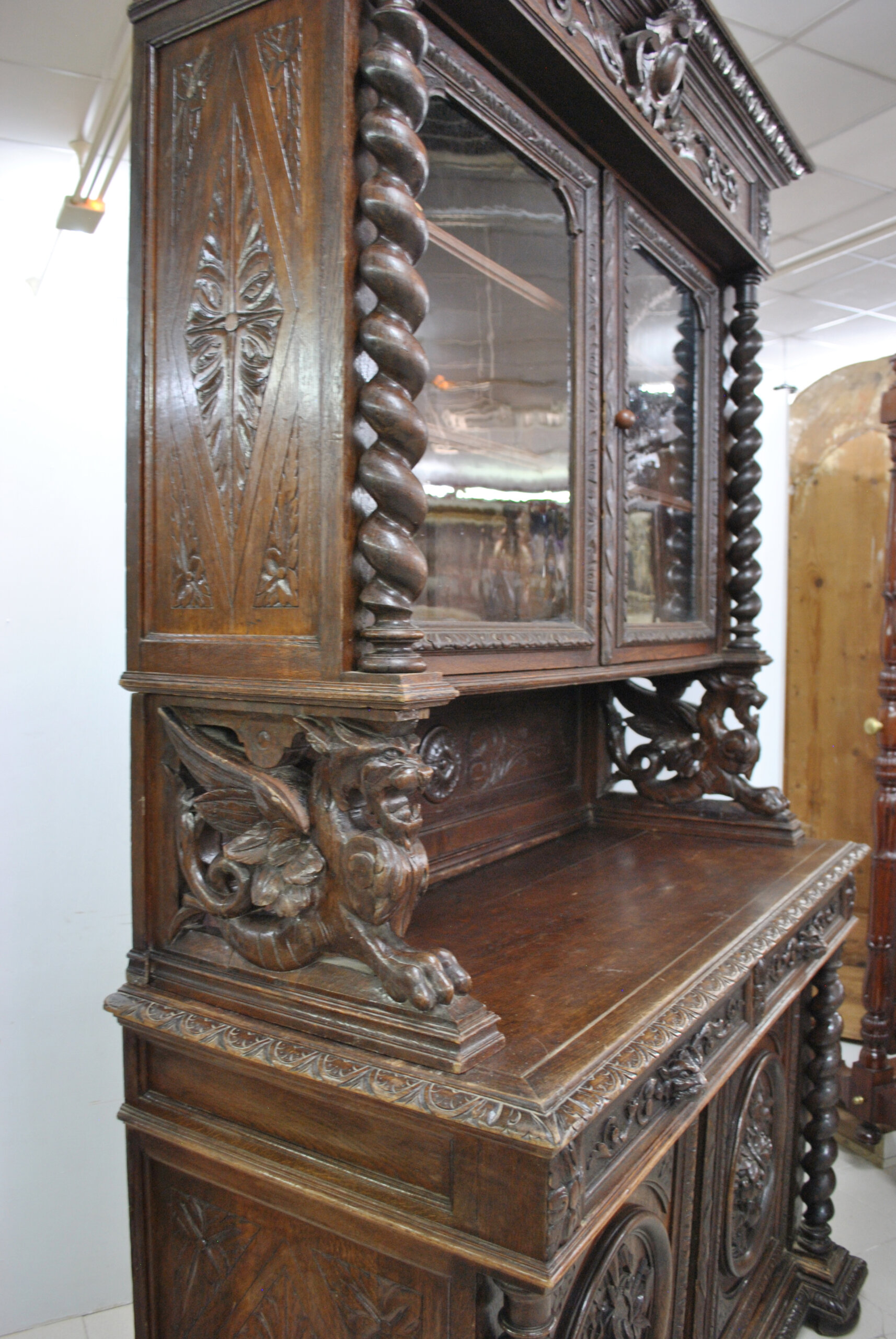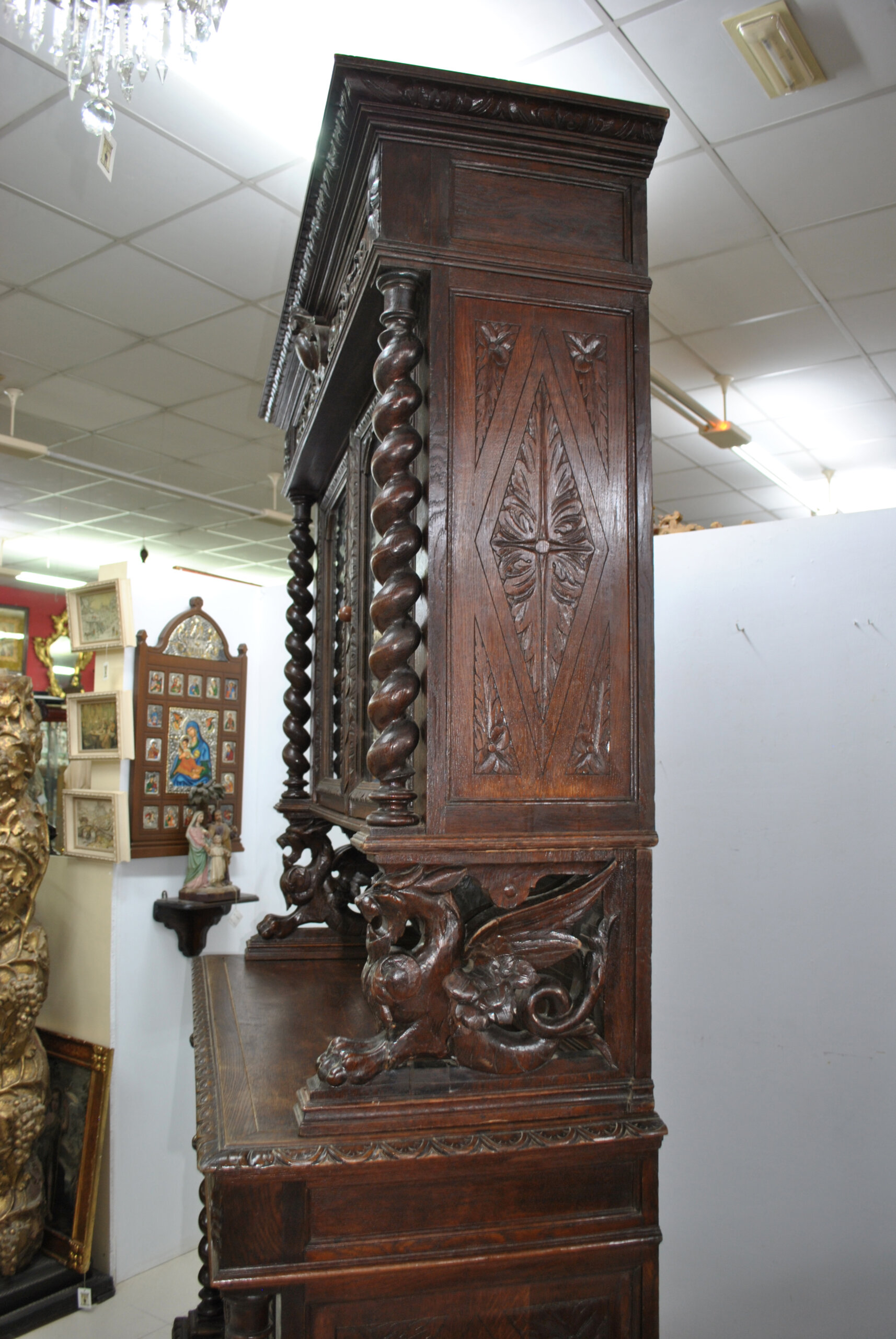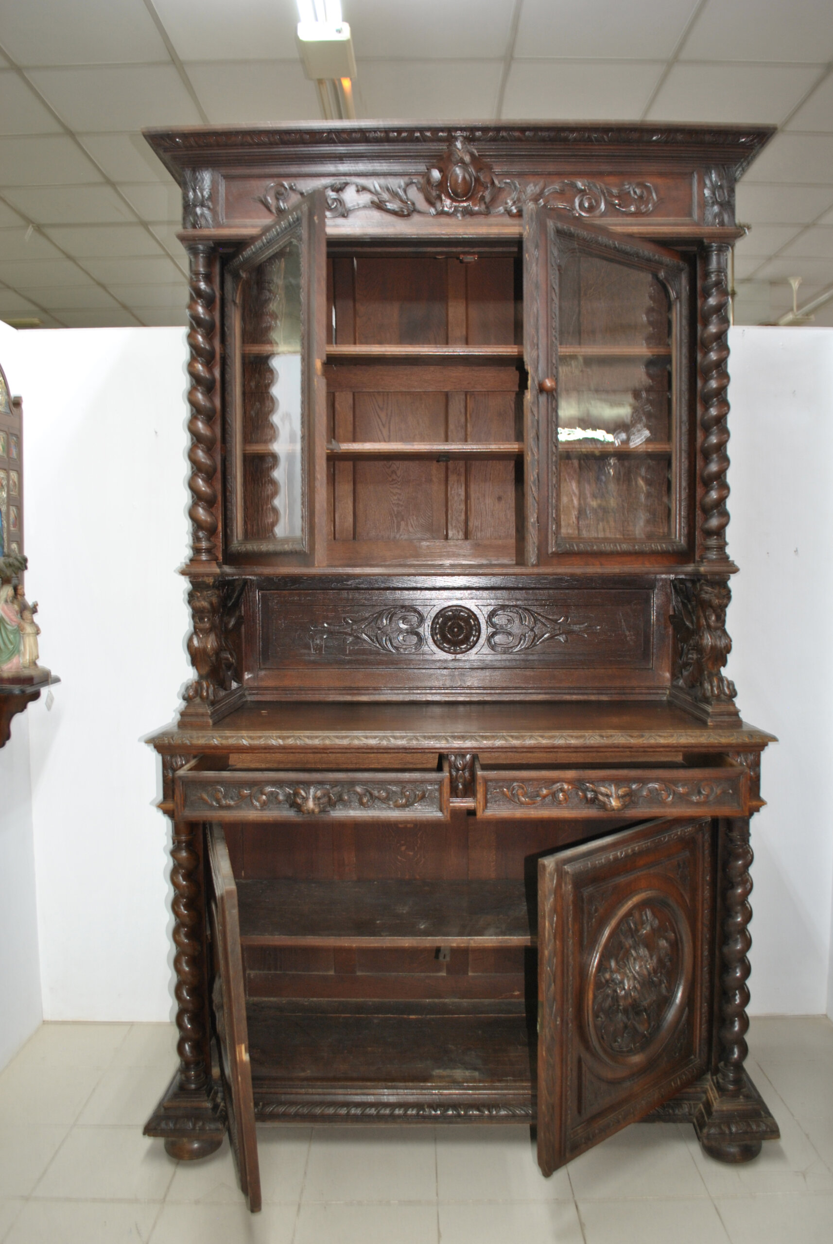 REF: 11970 – Precioso trinchero, aparador o vitrina de estilo renacimiento tallado en madera de roble macizo, de exquisita elaboración artesanal y gran presencia decorativa. La parte superior cuenta con dos puertas acristaladas con estantes interiores, enmarcadas por elegantes columnas salomónicas talladas a mano y rematadas con una cornisa de abundante ornamentación vegetal y motivos de rocalla. En la zona intermedia se aprecia una repisa de apoyo y un friso profusamente labrado con relieves florales y cartelas. La parte inferior dispone de dos amplios cajones y dos puertas con medallones circulares en relieve que representan escenas alegóricas de instrumentos y flores, flanqueadas también por columnas de cuidada factura. Destacan los detalles escultóricos en los laterales, con figuras fantásticas de grifos finamente tallados, así como los paneles laterales con decoración geométrica y vegetal.